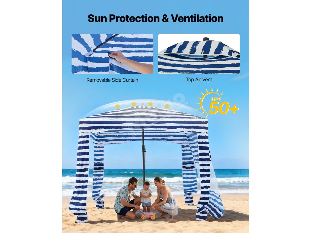 Tento plážový stan Cabana poskytuje ochranu pred slnkom až UPF 50+ a je vybavený odnímateľnou bočnou zástenou. Pripevnite ju pre maximálny tieň alebo ju odpojte a užite si otvorený, dobre vetraný priestor.