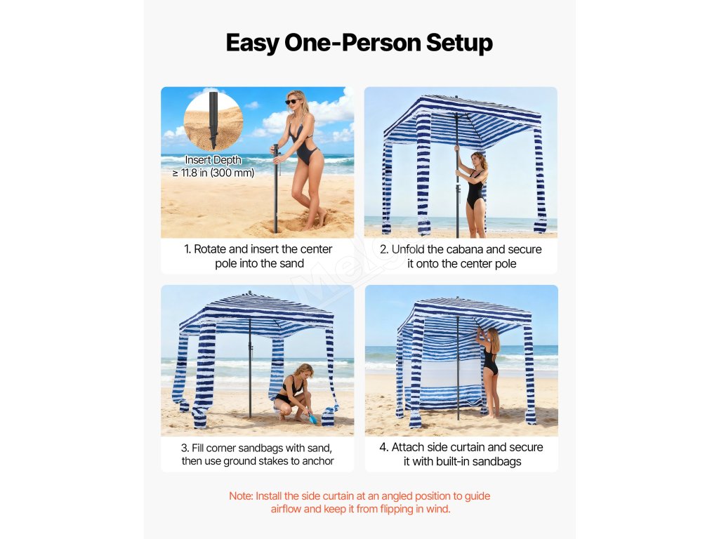 Každý roh stanu Cabana je vybavený vrecami s pieskom a kolíkmi do zeme na bezpečné ukotvenie. Bočný záves tiež obsahuje vrecia s pieskom, ktoré zabraňujú jeho odfúknutiu, a využíva hmotnosť piesku na zvýšenie celkovej stability.