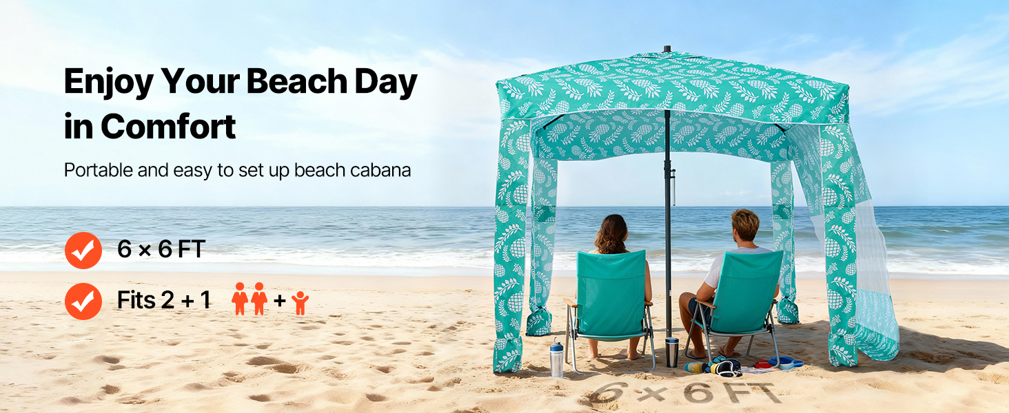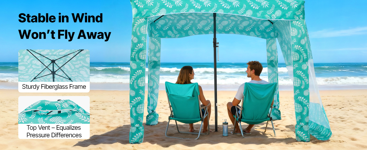 Pevný rám zabraňuje ohýbaniu alebo deformácii vo veternom počasí. Vrchný ventilačný systém vyrovnáva vnútorný a vonkajší tlak vzduchu, čím udržiava veľkú plážovú kabínu stabilnú a zároveň podporuje prúdenie vzduchu.