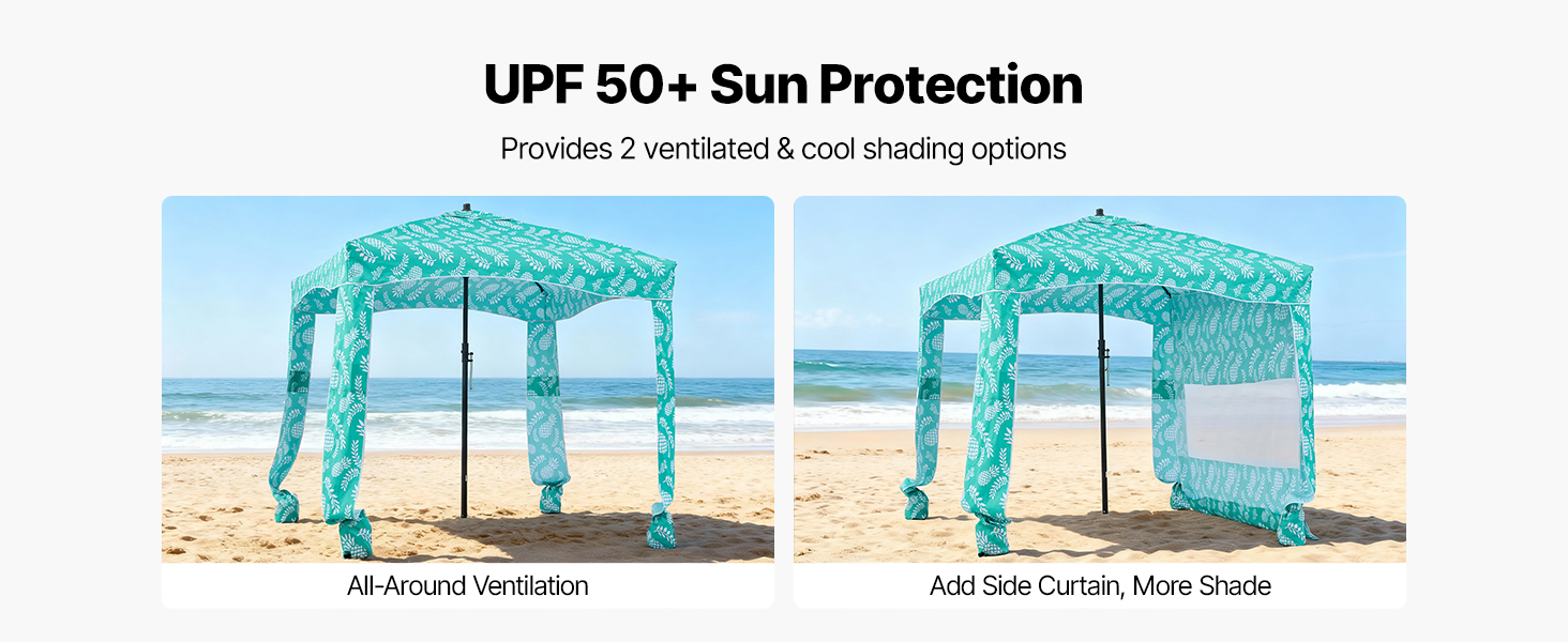 Tento plážový stan Cabana poskytuje ochranu pred slnkom až UPF 50+ a je vybavený odnímateľnou bočnou zástenou. Pripevnite ju pre maximálny tieň alebo ju odpojte a užite si otvorený, dobre vetraný priestor.