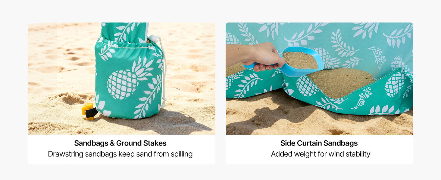 Každý roh stanu Cabana je vybavený vrecami s pieskom a kolíkmi do zeme na bezpečné ukotvenie. Bočný záves tiež obsahuje vrecia s pieskom, ktoré zabraňujú jeho odfúknutiu, a využíva hmotnosť piesku na zvýšenie celkovej stability.