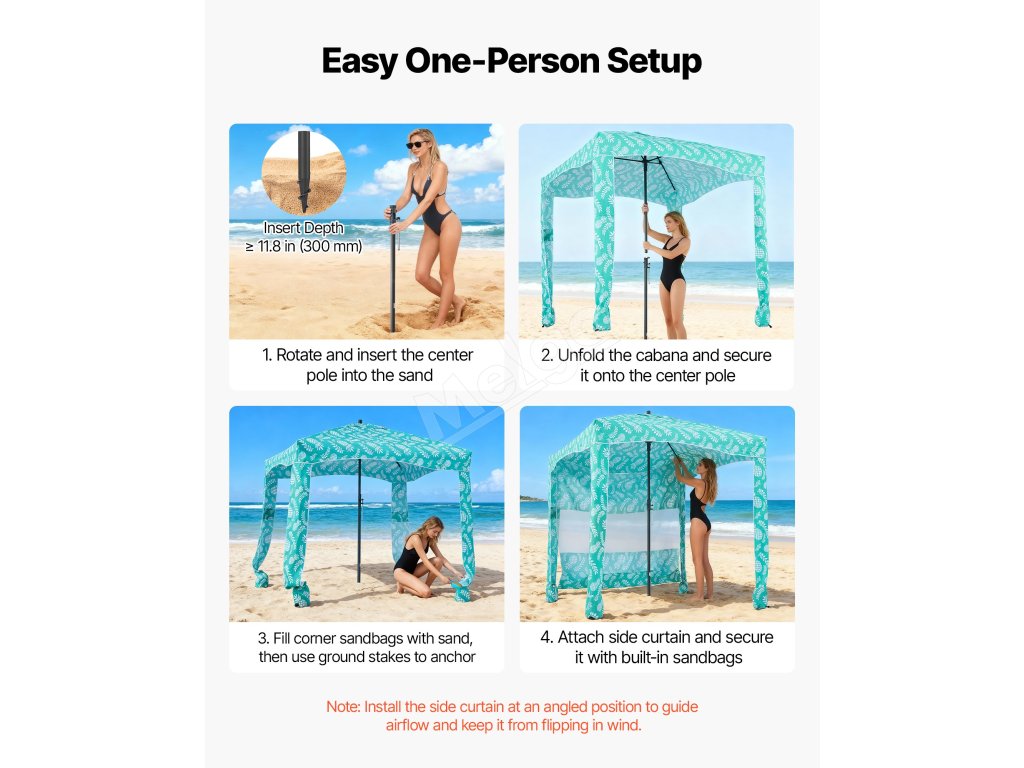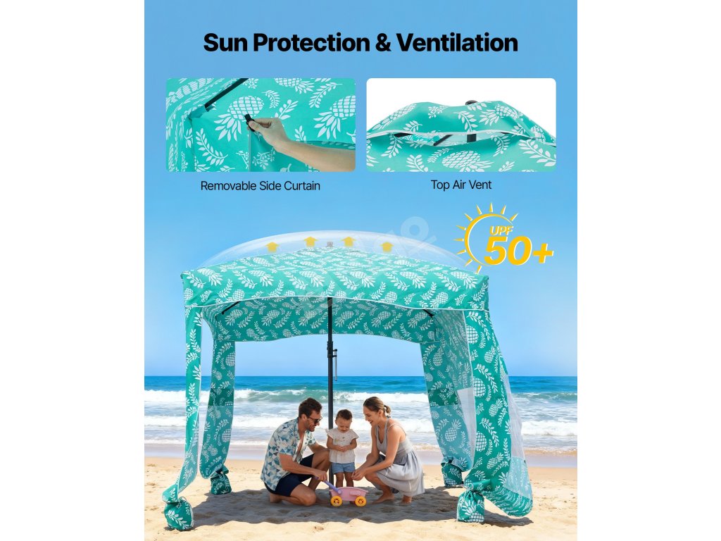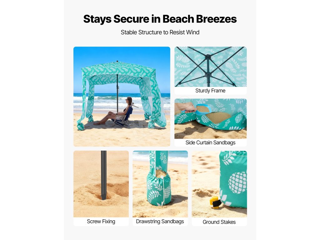 Pevný rám zabraňuje ohýbaniu alebo deformácii vo veternom počasí. Vrchný ventilačný systém vyrovnáva vnútorný a vonkajší tlak vzduchu, čím udržiava veľkú plážovú kabínu stabilnú a zároveň podporuje prúdenie vzduchu.