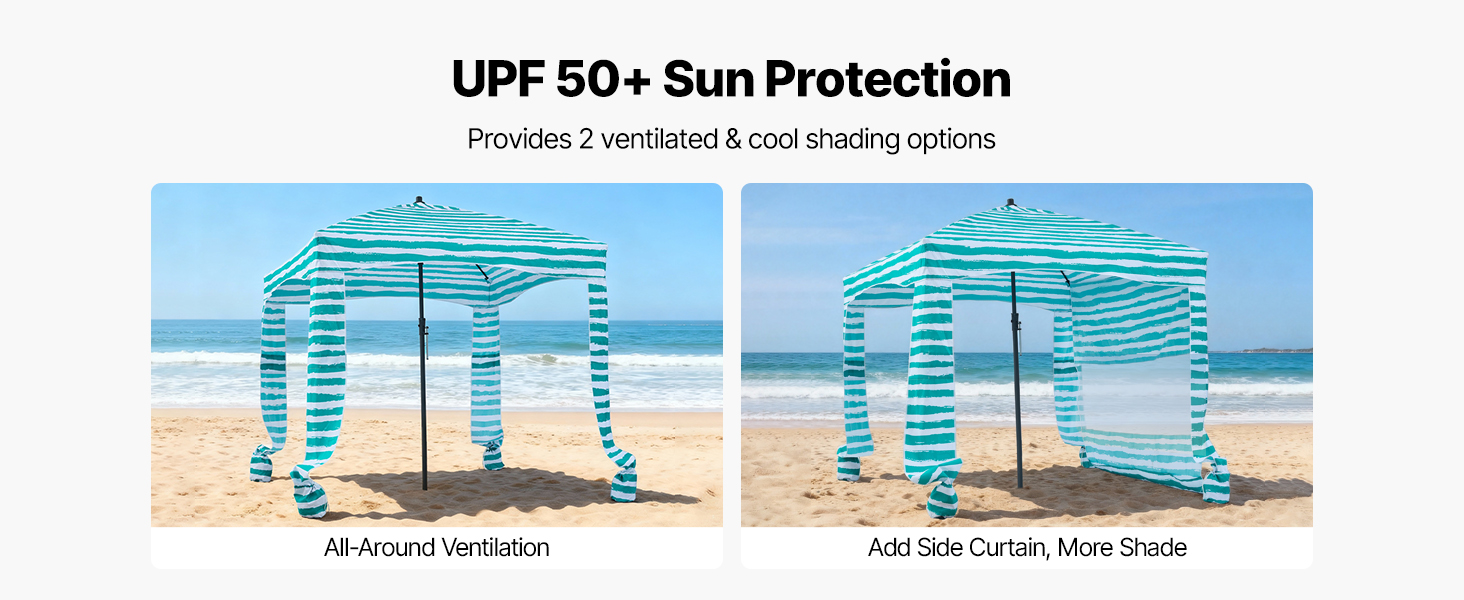 Tento plážový stan Cabana poskytuje ochranu pred slnkom až UPF 50+ a je vybavený odnímateľnou bočnou zástenou. Pripevnite ju pre maximálny tieň alebo ju odpojte a užite si otvorený, dobre vetraný priestor.