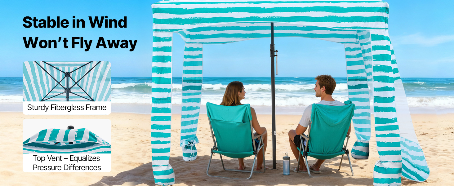 Pevný rám zabraňuje ohýbaniu alebo deformácii vo veternom počasí. Vrchný ventilačný systém vyrovnáva vnútorný a vonkajší tlak vzduchu, čím udržiava veľkú plážovú kabínu stabilnú a zároveň podporuje prúdenie vzduchu.