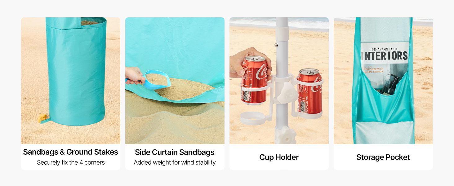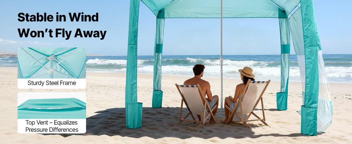 Tento plážový stan Cabana dokáže jedna osoba rýchlo rozložiť a zabezpečiť bez zložitého zostavovania. Bočný záves by mal byť nainštalovaný v šikmej polohe, aby usmerňoval prúdenie vzduchu a zabránil prevráteniu kabíny vo vetre.