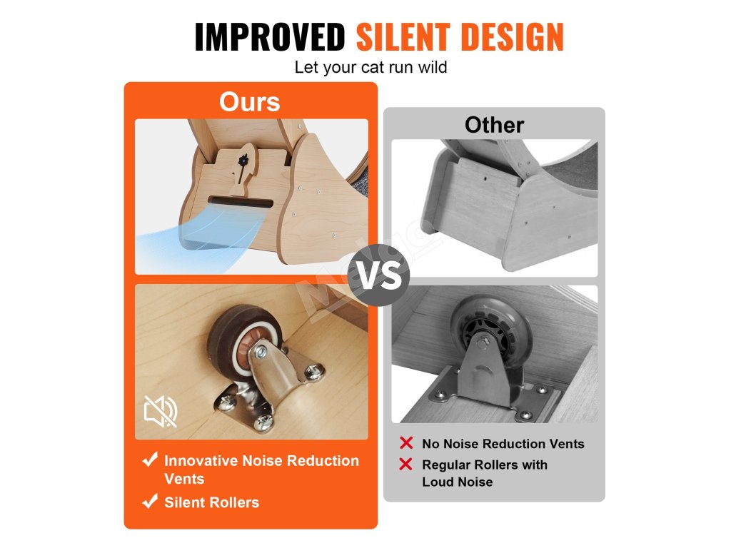 Vďaka tichému koliesku a otvorom znižujúcim hluk dokáže naše koliesko pre mačky znížiť hluk o 10 - 20 %, čím vytvára pokojné a príjemné prostredie na cvičenie pre vášho domáceho miláčika. To vám umožní harmonické spolužitie s vaším domácim miláčikom a rodinou.