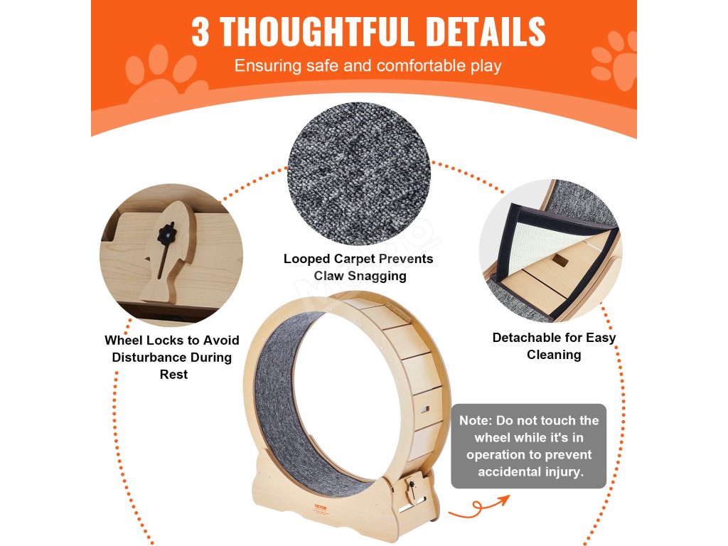Toto koliesko na cvičenie mačiek je vyrobené z masívneho dreva, čo zaručuje jeho odolnosť. Vďaka priestrannej 12,6-palcovej základni poskytuje vašej mačke stabilný priestor na cvičenie. Jedinečná konštrukcia s medzerou 0,2"/6 mm zaisťuje bezpečnosť a umožňuje vášmu mačaciemu spoločníkovi voľne behať na koliesku.