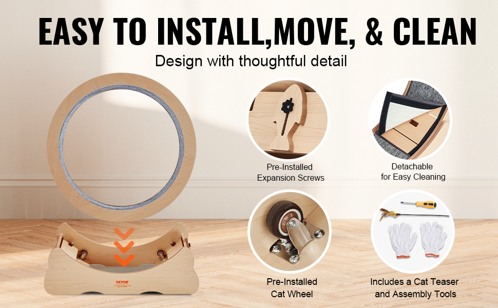 Vďaka odnímateľnej vnútornej podložke je čistenie hračka. Vnútornú podložku môžete jednoducho vybrať a vyčistiť alebo vymeniť. Vďaka predinštalovanému koliesku na behanie mačiek a rozperným skrutkám je inštalácia jednoduchšia a bezpečnejšia, čo vám poskytuje väčšie pohodlie.