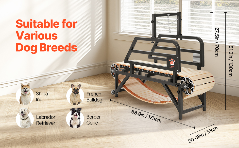 Je vybavený výškovo nastaviteľnými nohami na úpravu sklonu, vďaka čomu môžete ľahko ovládať intenzitu cvičenia vášho psa na efektívne spaľovanie tukov.