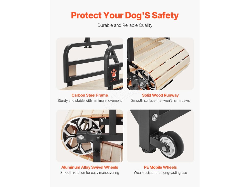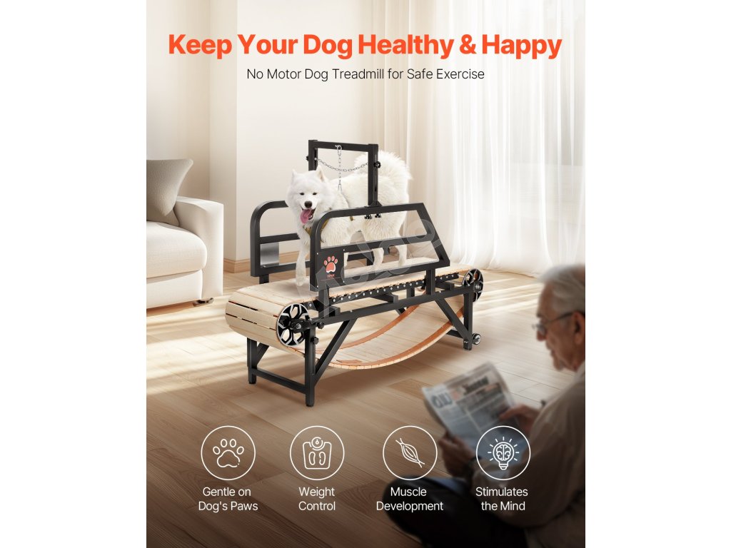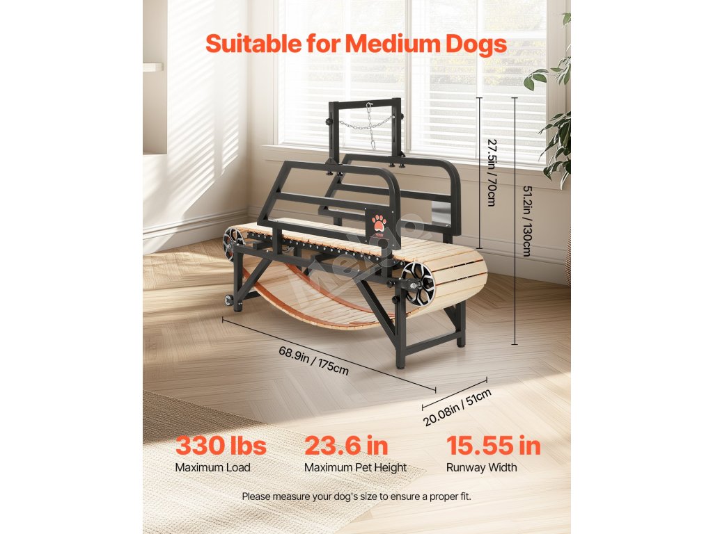 Tento bežecký pás pre psov vyrobený z uhlíkovej ocele s drevenou dráhou a hliníkovými valcami ponúka pohodlné cvičenie bez elektrickej energie. Medzi funkcie patrí nastaviteľné upevnenie vodítka a nastavenie sklonu, vďaka čomu je ideálny pre stredne veľké až veľké psy do 330 kg. Ideálny na cvičenie v interiéri za každého počasia.