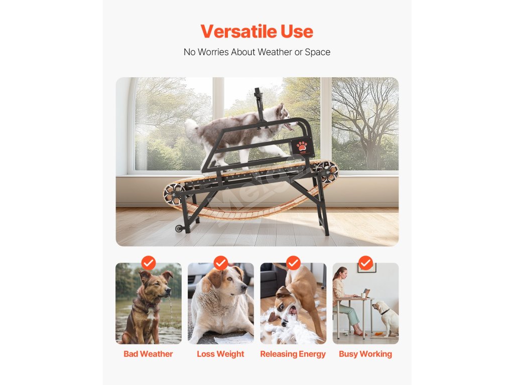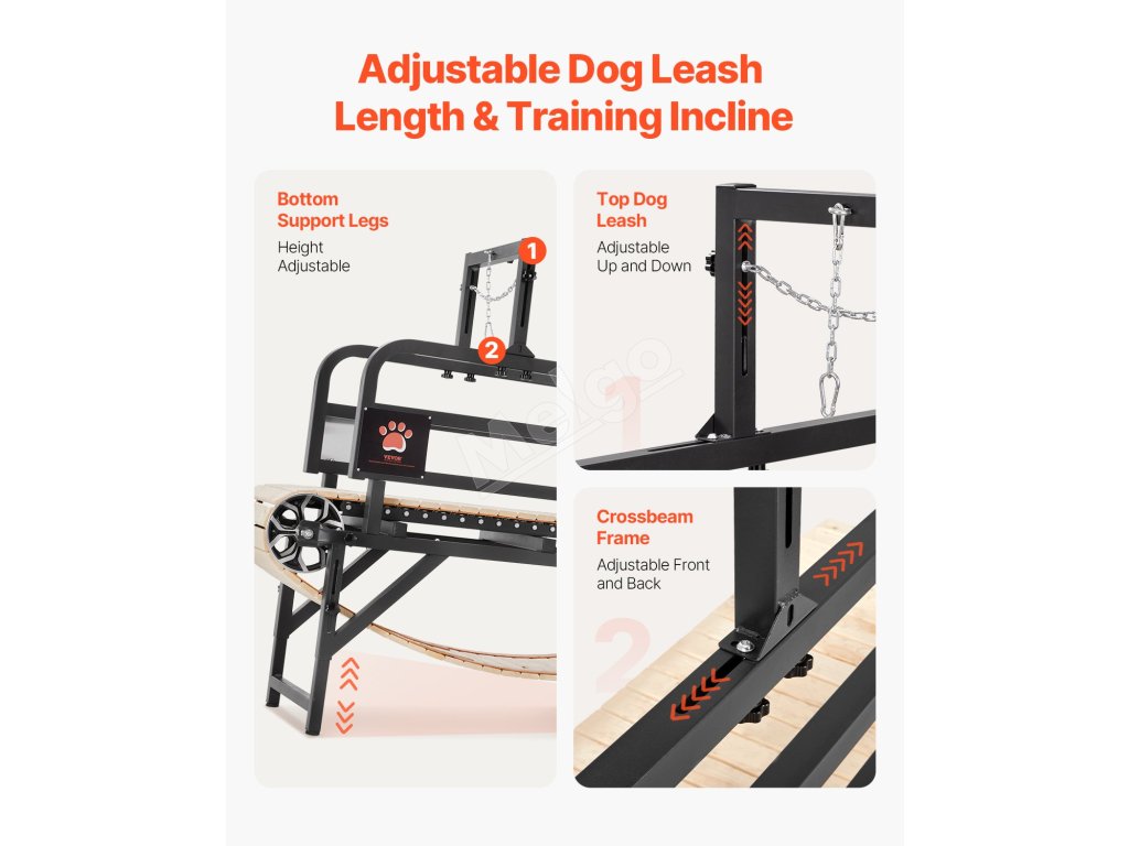 Je vybavený výškovo nastaviteľnými nohami na úpravu sklonu, vďaka čomu môžete ľahko ovládať intenzitu cvičenia vášho psa na efektívne spaľovanie tukov.