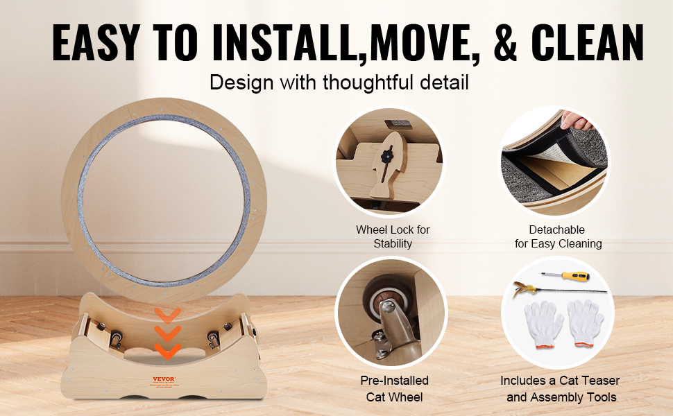 Vďaka odnímateľnej vnútornej podložke je čistenie hračka. Vnútornú podložku môžete jednoducho vybrať a vyčistiť alebo vymeniť. Vďaka predinštalovanému koliesku na behanie mačiek a rozperným skrutkám je inštalácia jednoduchšia a bezpečnejšia, čo vám poskytuje väčšie pohodlie.