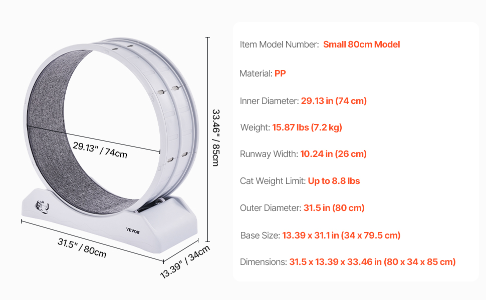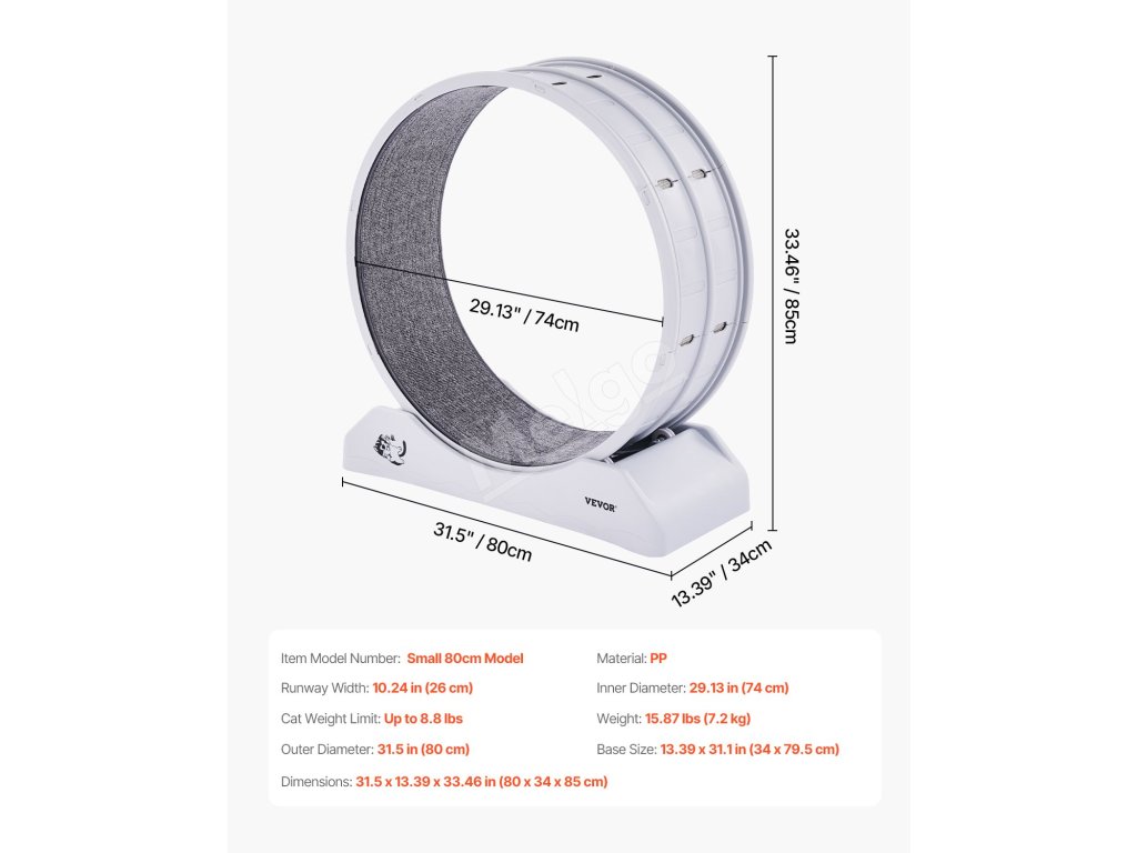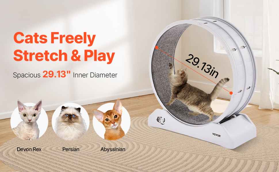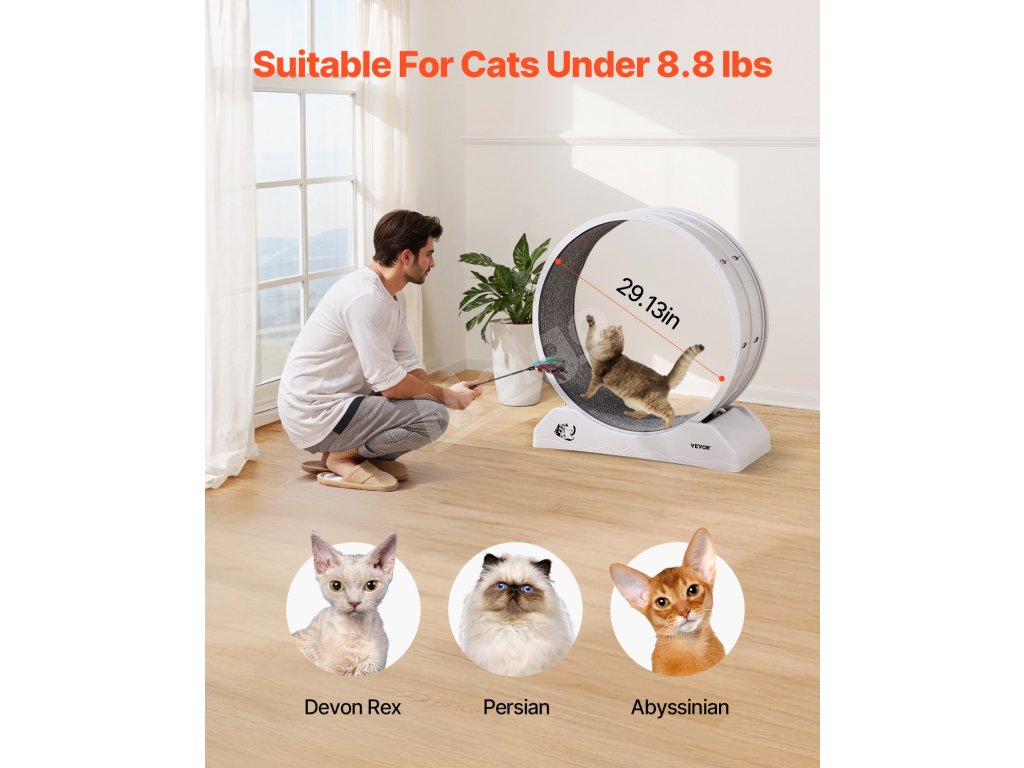 Vďaka veľkorysému vnútornému priemeru ponúka toto koliesko na behanie pre mačky dostatok priestoru na pohodlné cvičenie vášho domáceho maznáčika. Je určené pre mačky s hmotnosťou do 8,8 kg a predstavuje pre ne ideálny priestor na pretiahnutie nôh a zábavné cvičenie!