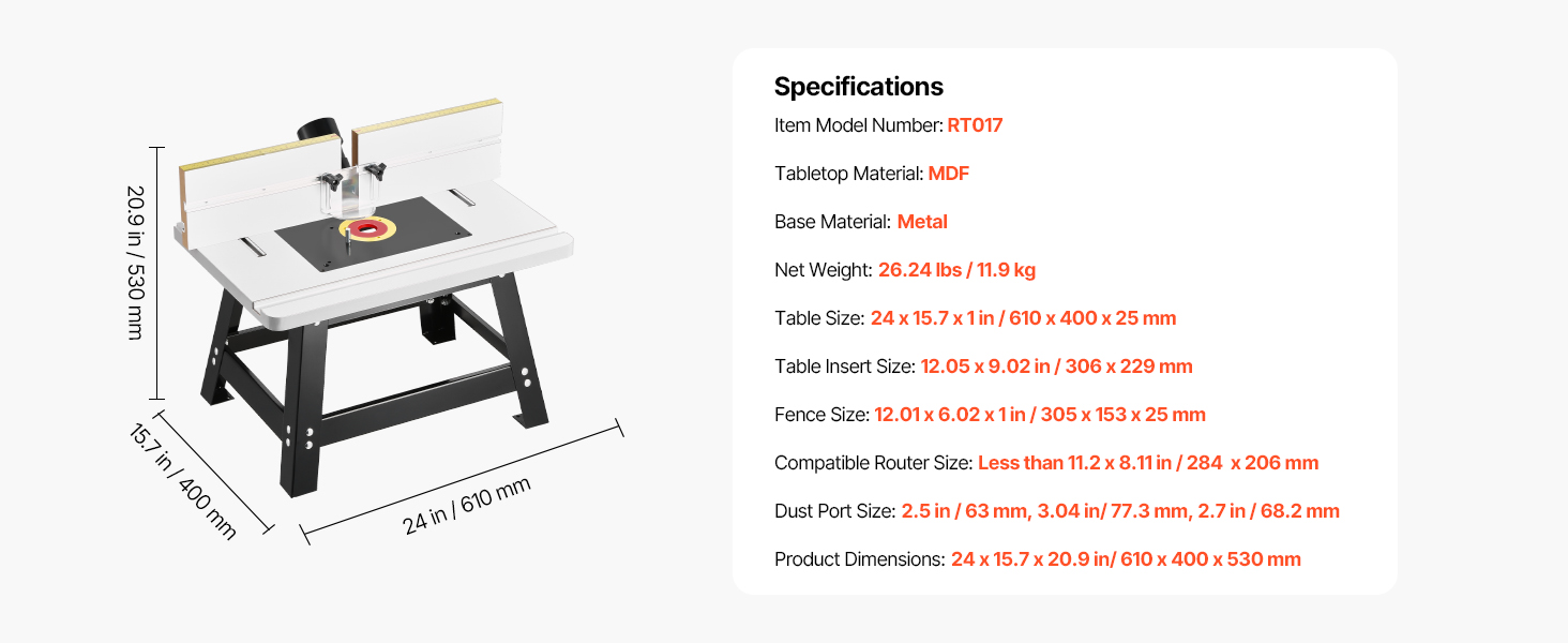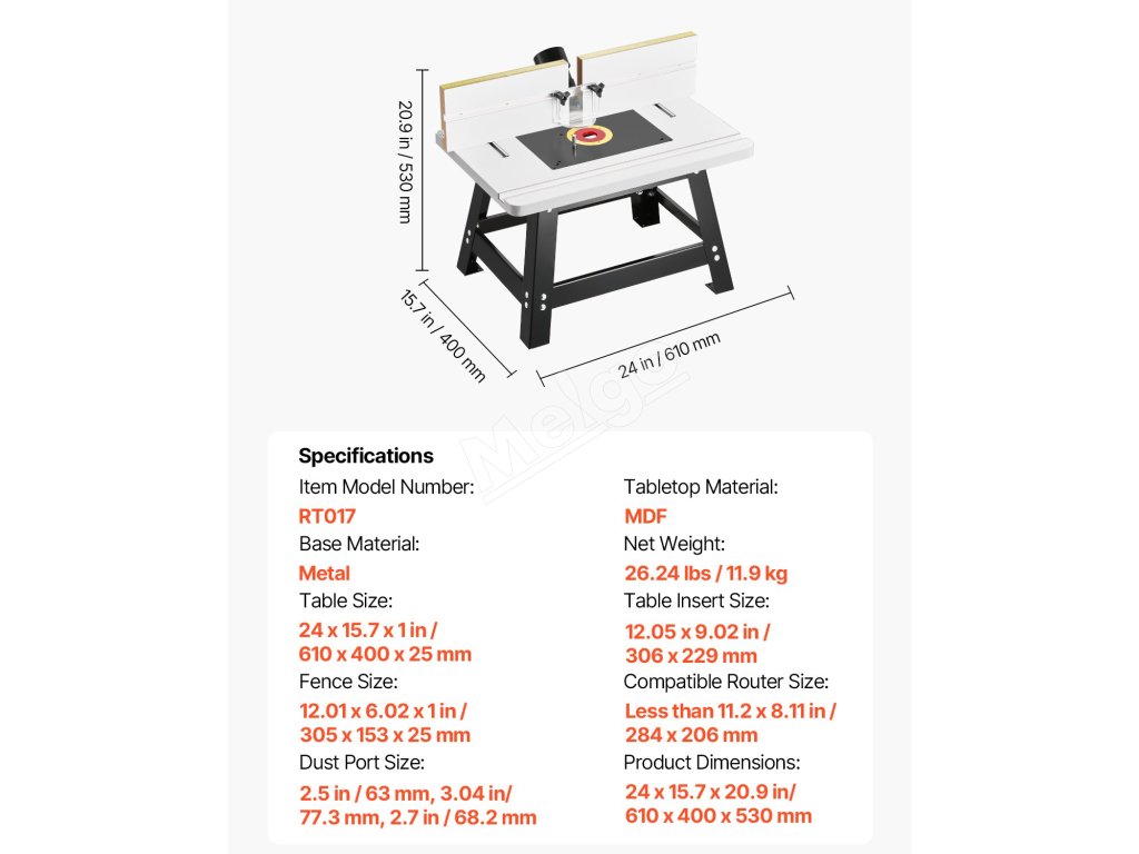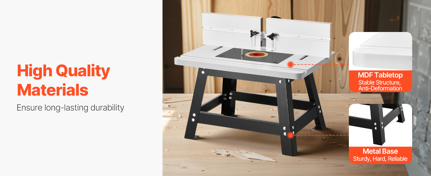 Tento frézovací stôl, vyrobený s doskou z MDF, je hladký a rovný pre dlhodobý výkon. Dodáva sa s kovovou základňou, ktorá poskytuje pevnú a spoľahlivú oporu a zaručuje odolnosť a vysokú nosnosť na dlhé roky.