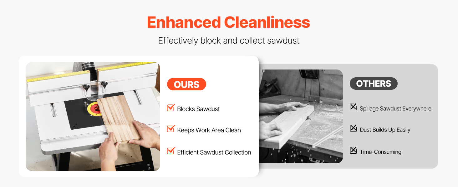 Tento stolík na frézovanie má kovovú základňu pre pevnú oporu. Nastaviteľný plot zabezpečuje presné umiestnenie dreva na presné rezy. Port na zachytávanie prachu udržiava váš pracovný priestor čistý. Je kompatibilný s rôznymi frézami a vrtákmi a umožňuje vám ľahko rezať, orezávať, vŕtať a tvarovať.