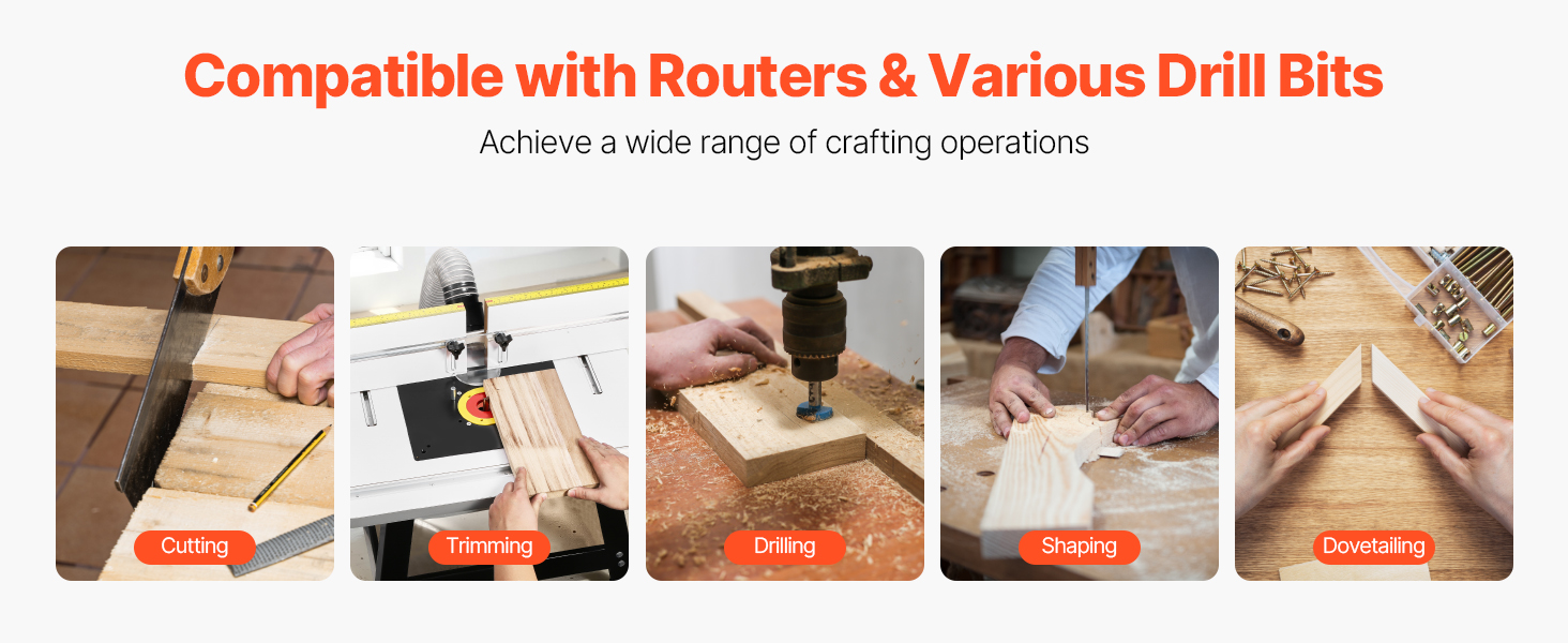 Spárujte tento frézovací stôl so svojou frézou a výmenou rôznych vrtákov bez námahy režete, upravujete hrany, vŕtate, tvarujete a vytvárate holubičie drážky v dreve. Zažite efektívne, pohodlné a presné remeselné práce zakaždým.
