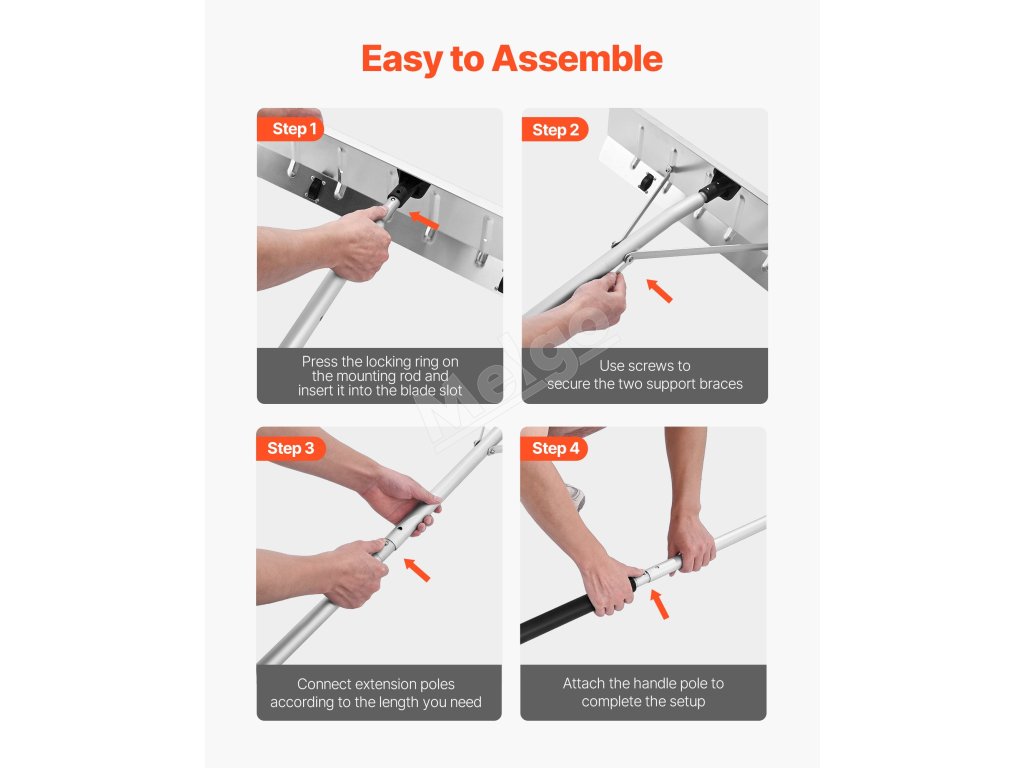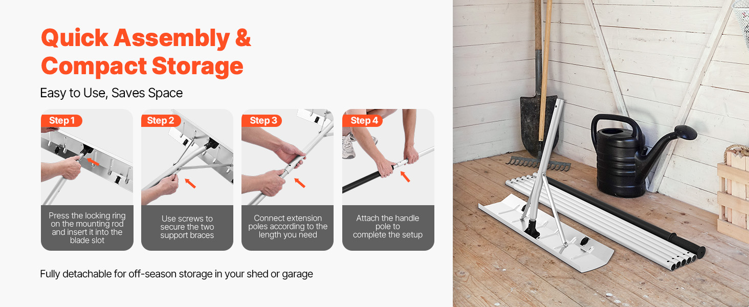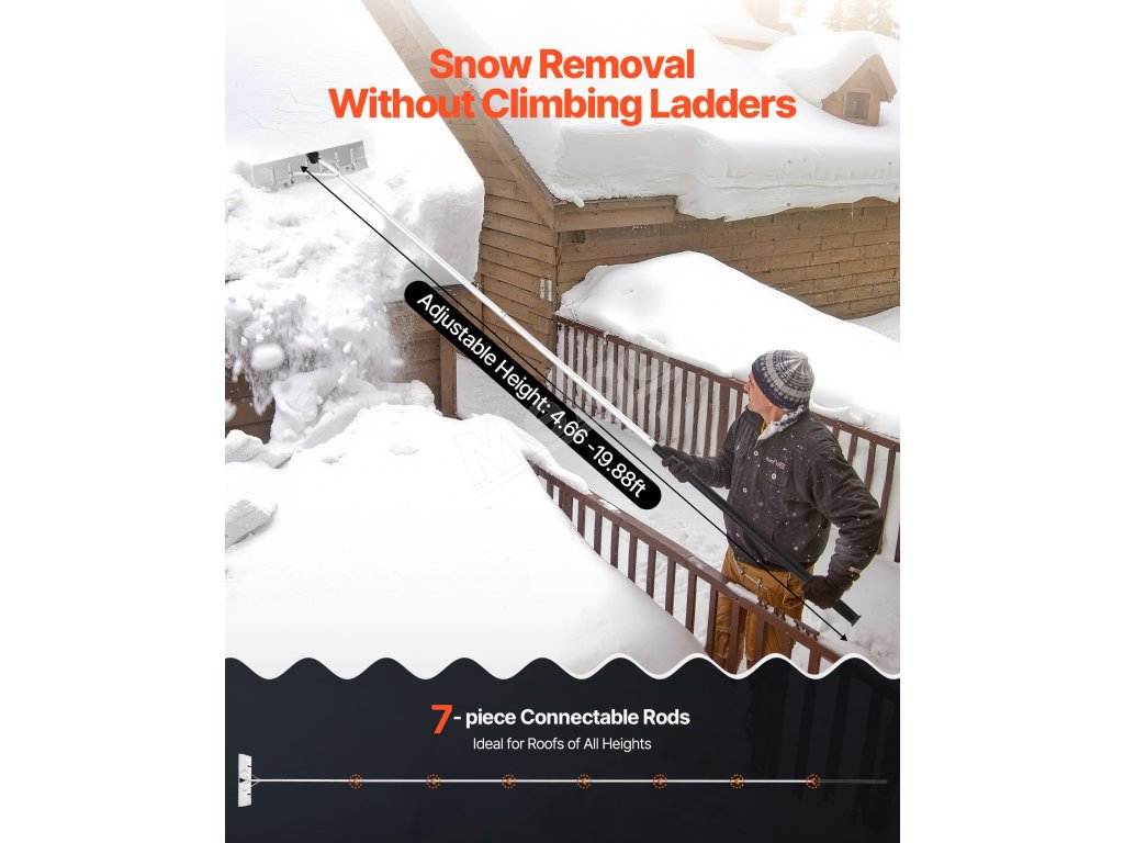 Odnímateľná konštrukcia umožňuje tieto strešné hrable na odstraňovanie snehu ľahko rozložiť, keď sa nepoužívajú. Kompaktné rozmery uľahčujú jeho skladovanie v skriniach alebo garážach a zároveň uľahčujú jeho prenášanie a premiestňovanie.