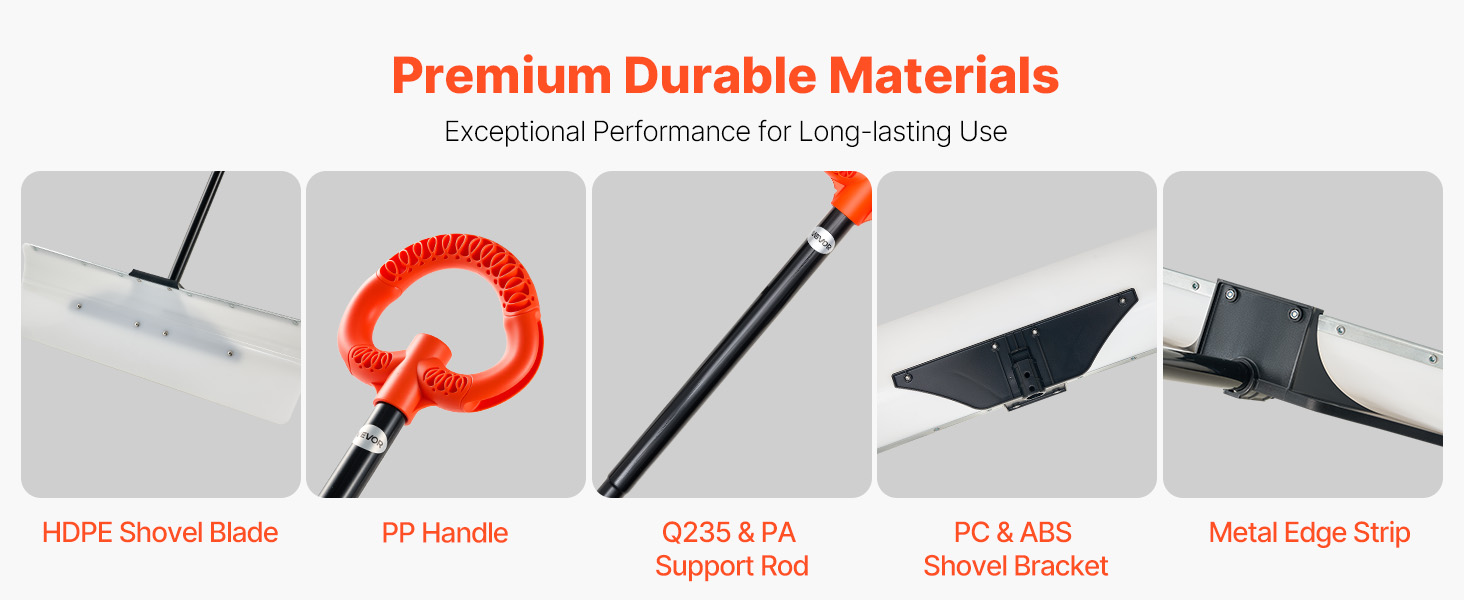 Zimná lopata je vybavená vysokokvalitnou čepeľou z HDPE, robustnou rukoväťou z PP, nosnými tyčami z Q235 a PA a odolným rámom z PC a ABS. Jeho zosilnená kovová 1hrana zabraňuje deformácii a krúteniu, čím zvyšuje odolnosť lopaty.