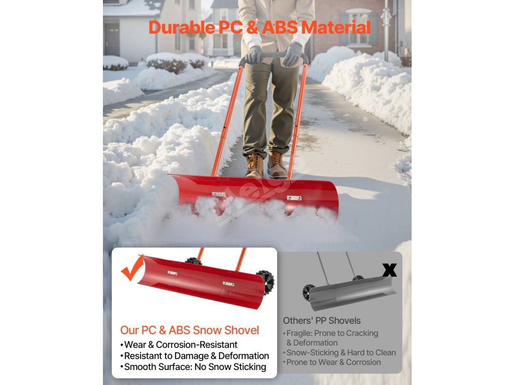 Čepeľ lopaty na sneh je vyrobená z PC a ABS pre vynikajúcu odolnosť voči nárazom. Kolieska z PP sú pružné a odolné, zatiaľ čo oceľová rúrka a rukoväť z PVC s penovým polstrovaním zabezpečujú pohodlie a protišmykové používanie. Hliníková nosná tyč poskytuje stabilitu a držiak kolies PA & Q235 ponúka silnú podporu hmotnosti.