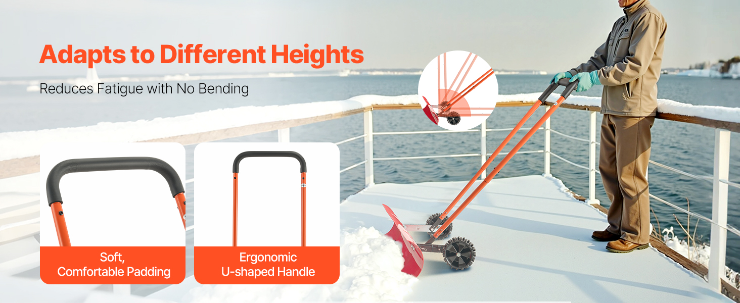 Táto zimná lopata na sneh vybavená 90° nastaviteľnou rukoväťou vám umožňuje prispôsobiť uhol pre optimálne pohodlie. Pomáha predchádzať ohýbaniu, čím znižuje únavu rúk a chrbta Ergonomická rukoväť v tvare písmena U a mäkké polstrovanie ponúkajú pevný úchop a zároveň zmierňujú tlak na ruky.
