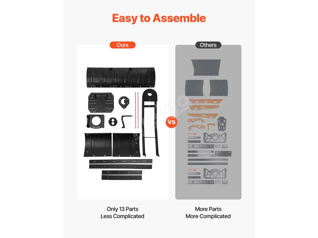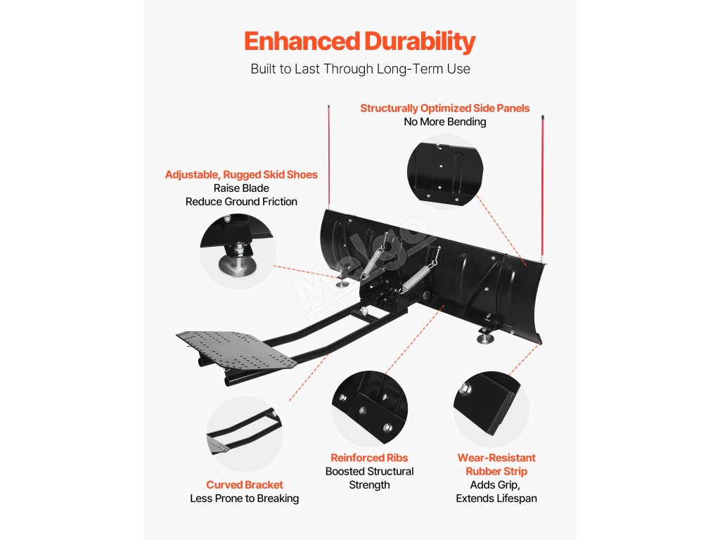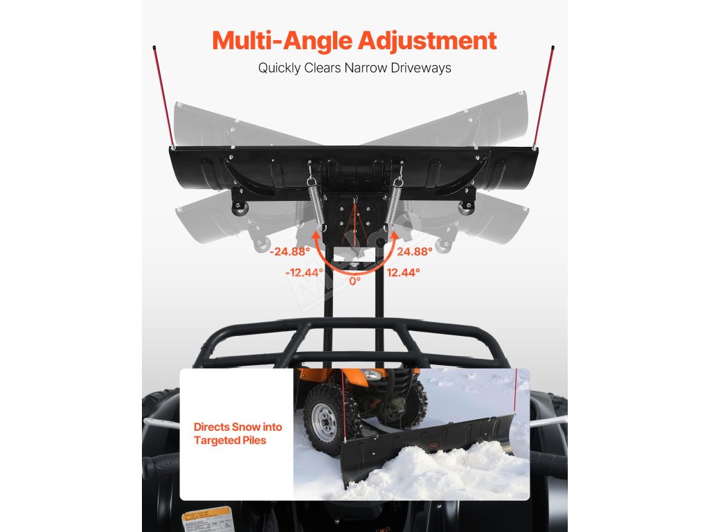 Náš snehový pluh je navrhnutý pre širokú kompatibilitu s vozidlami, má viacdrážkové operadlo pre 3 možnosti montáže, ktoré sa hodia pre väčšinu modelov ATV a UTV. 2 nastaviteľné šírky 43"/60" v kombinácii s 5-polohovým ovládaním uhla (±24,88°) a 4-úrovňovým nastavením výšky pre rôzne podmienky.