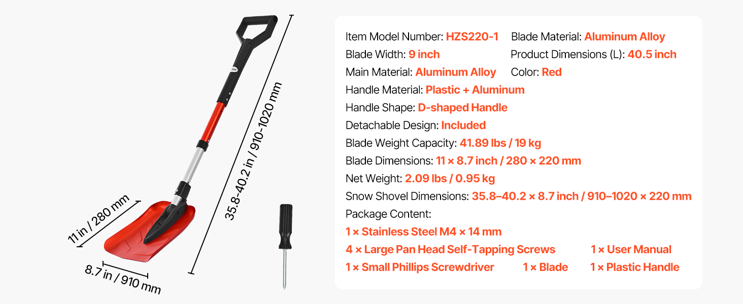 | Rozmery lopaty na sneh | 35.8-40,2 x 8,7 palca/910-1020 x 220 mm |
