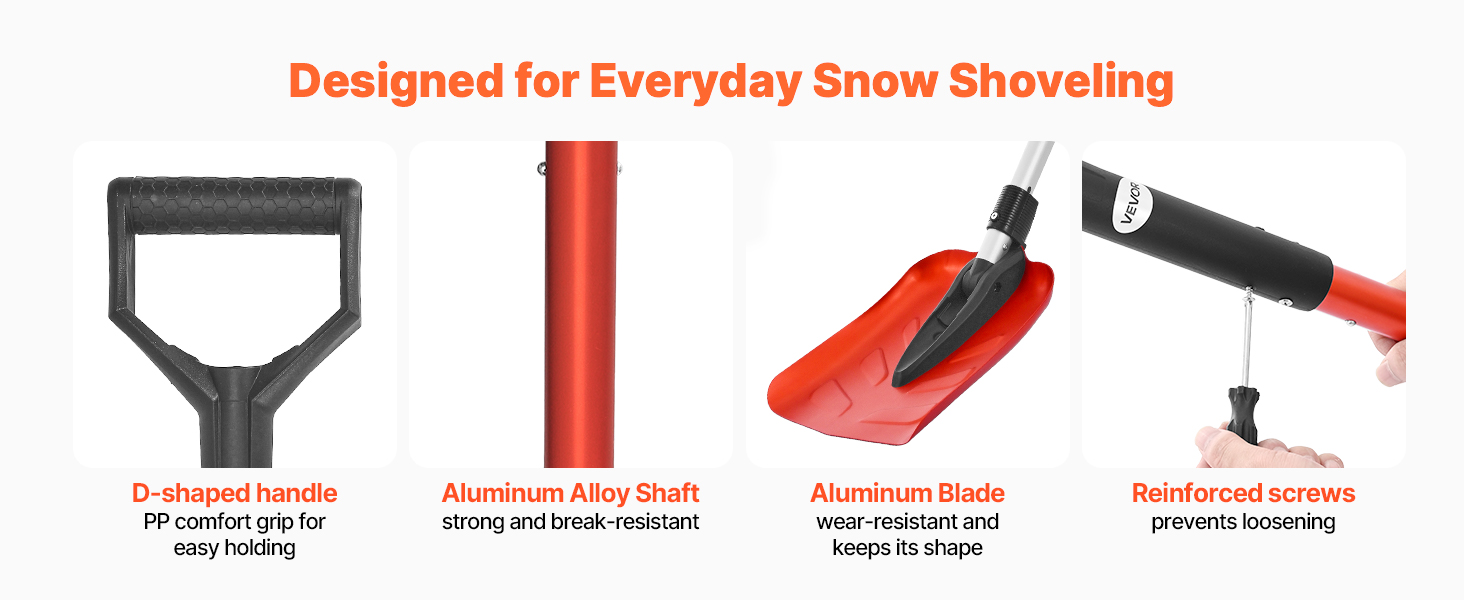 Ľahké lopaty na sneh sú vybavené odolnou rovnou rukoväťou z PVC pre stabilné uchopenie bez zamŕzania. Dodáva sa s robustnou hliníkovou čepeľou a oceľovým hriadeľom so zosilnenými skrutkami proti uvoľneniu, ktoré zabraňujú zlomeniu hriadeľa a zlepšujú účinnosť čistenia.