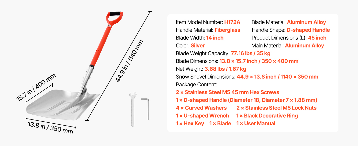 | Rozmery lopaty na sneh | 44.9 x 13,8 in/1140 x 350 mm |