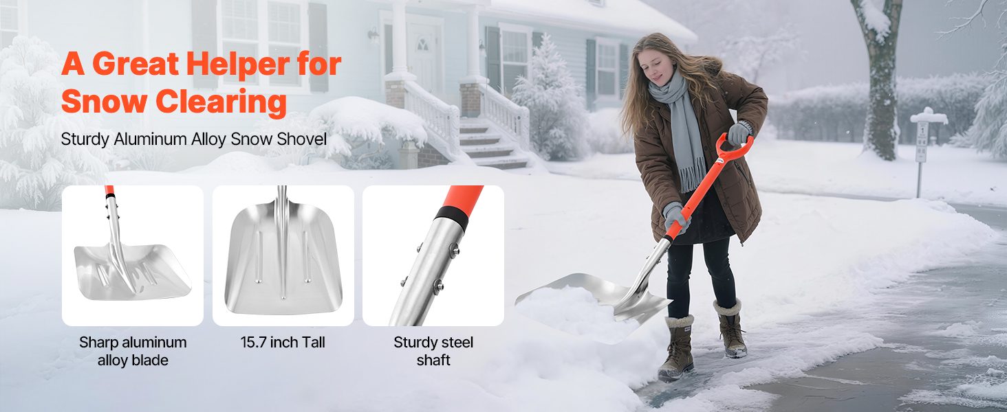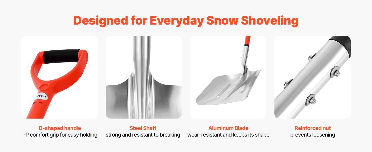 Ľahké lopaty na sneh sú vybavené odolnou rovnou rukoväťou z PVC na stabilné uchopenie bez zamŕzania. Dodáva sa s robustnou hliníkovou čepeľou na hladké odpratávanie snehu a oceľovým hriadeľom so zosilnenou maticou proti uvoľneniu, ktorá zabraňuje zlomeniu hriadeľa a zvyšuje účinnosť čistenia.