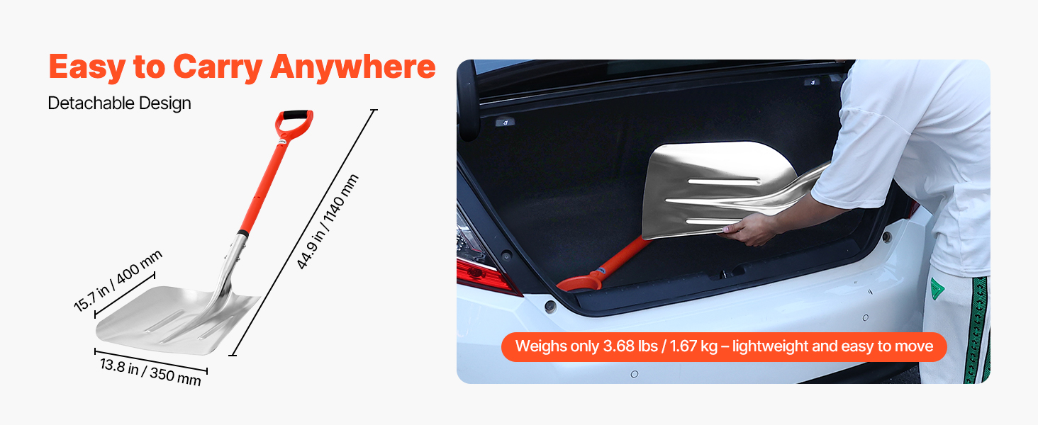 Tieto ľahké lopaty na sneh vážia len 3,68 kg, ktoré sa dajú ľahko prenášať a uložiť do kufra, kôlne na náradie alebo do rohu verandy bez toho, aby zaberali miesto. Pri dochádzaní do práce alebo na cestách ho môžete prevážať spolu s autom a poslúži vám ako prenosný pomocník pri cestovaní v nečakanej snehovej kalamite.