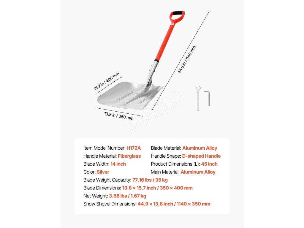 Lopata na sneh na príjazdovú cestu má robustnú hlavu z hliníkovej zliatiny odolnú voči chladu, ktorá je odolná voči praskaniu. Vďaka 15,7-palcovej vysokej čepeli dokáže naraz odstrániť viac snehu, čím sa zníži frekvencia prevádzky. Ideálny na zimné búrky a rýchle odpratávanie snehu, zvyšuje bezpečnosť cestovania a účinnosť odpratávania snehu.
