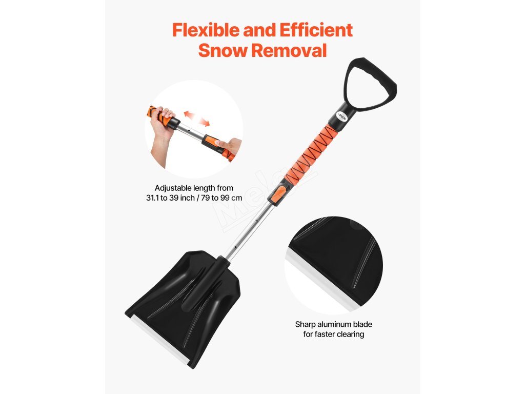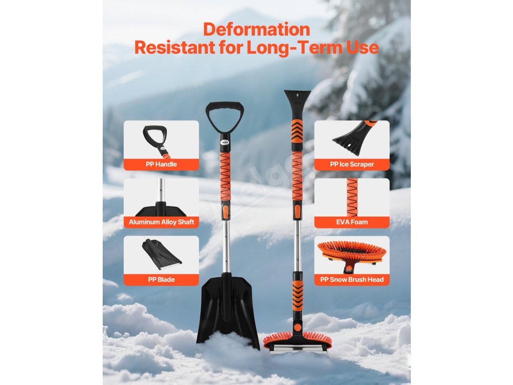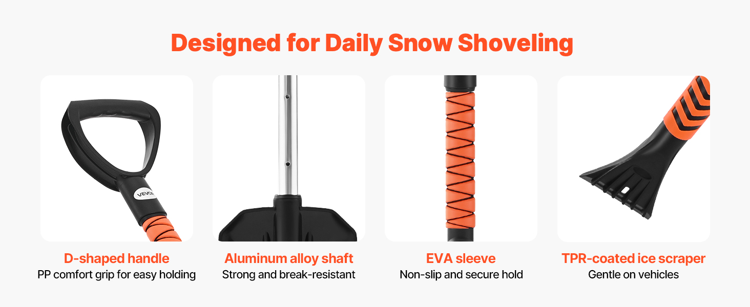 Ľahká lopata na sneh, vyrobená s robustnou hriadeľou z hliníkovej zliatiny, je odolná voči opotrebovaniu, tlaku a zlomeniu. Rukoväť typu D a vrstva z peny EVA zvyšujú pohodlie a odolnosť proti pošmyknutiu, zatiaľ čo škrabka na ľad s povrchovou úpravou TPR odstraňuje sneh a ľad bez poškriabania vášho auta, čo zaručuje dlhodobé používanie.