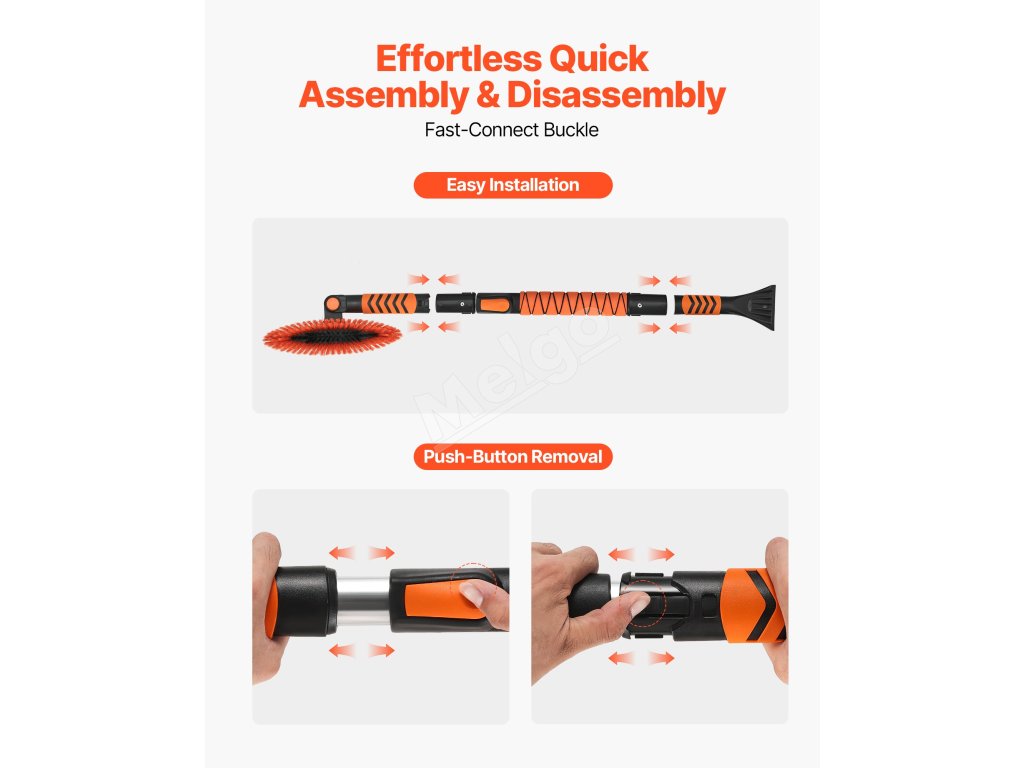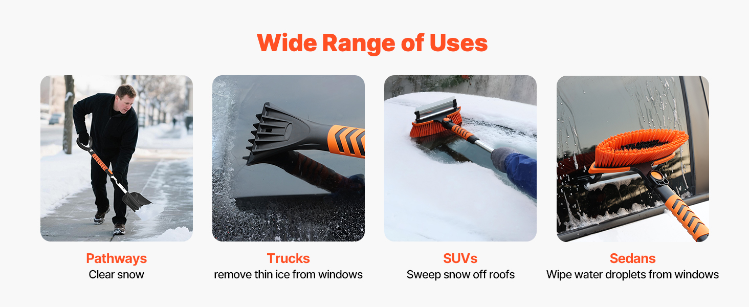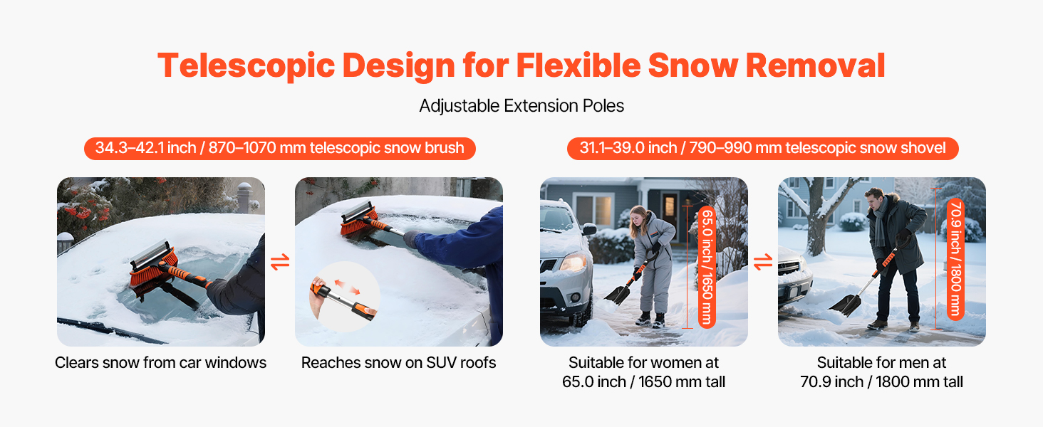 Teleskopická hriadeľ našej škrabky na ľad a kefy na sneh sa prispôsobuje rôznym výškam a polohám, vďaka čomu ľahko vyčistíte okná auta zblízka alebo dosiahnete na strechy SUV. Rýchle nastavenie dĺžky zvyšuje účinnosť a pohodlie, znižuje únavu z ohýbania alebo naťahovania.