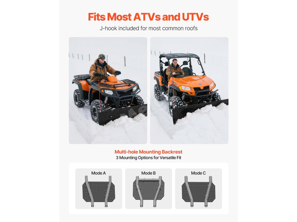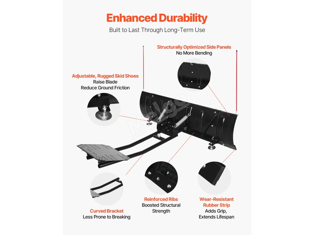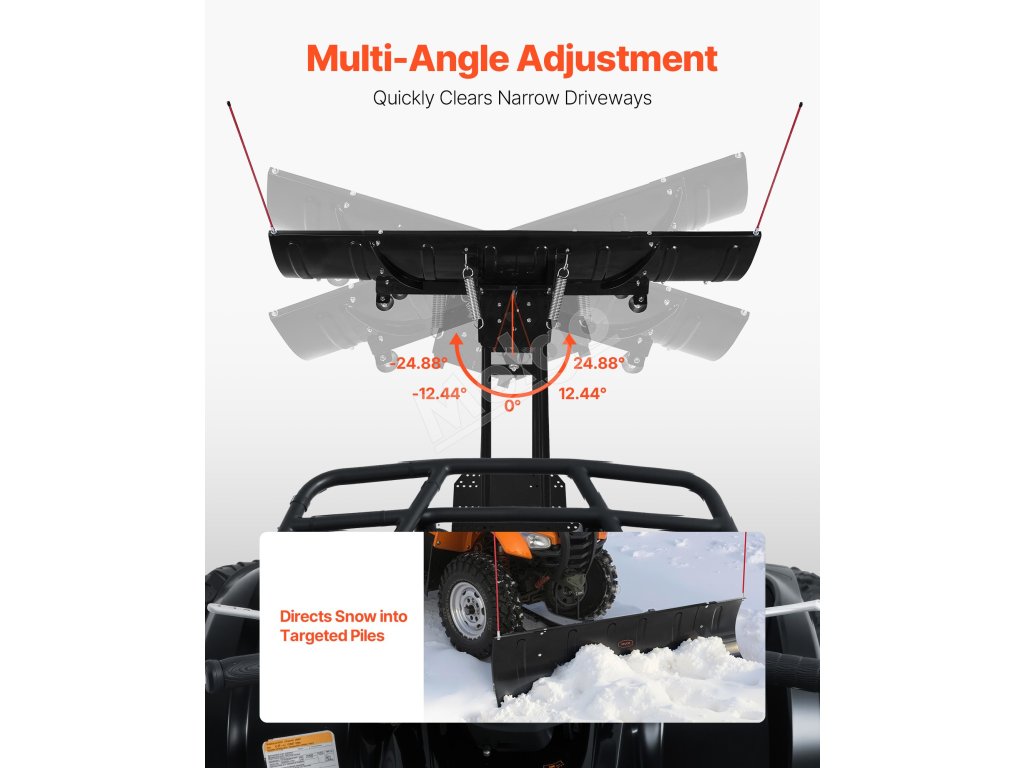 Náš snehový pluh je navrhnutý pre širokú kompatibilitu s vozidlami, má viacdrážkové operadlo pre 3 možnosti montáže, ktoré sú vhodné pre väčšinu modelov ATV a UTV. 2 nastaviteľné šírky 43"/72" v kombinácii s 5-polohovým ovládaním uhla (±24,88°) a 4-úrovňovým nastavením výšky pre rôzne podmienky.