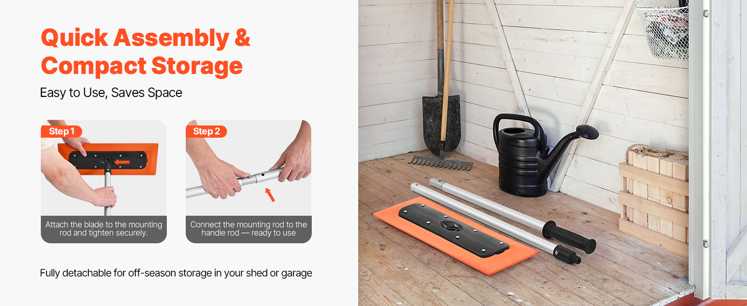 Odnímateľná konštrukcia umožňuje tieto strešné hrable na odstraňovanie snehu ľahko rozložiť, keď sa nepoužívajú. Kompaktné rozmery uľahčujú jeho uskladnenie v skrinkách alebo garážach a zároveň uľahčujú jeho prenášanie a premiestňovanie.