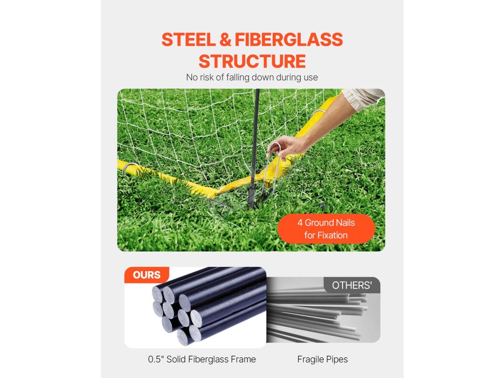 Futbalová sieť je skonštruovaná s pevným 0,5-palcovým rámom zo sklených vlákien, ktorý dopĺňajú robustné oceľové komponenty. Spolu so zaradením šiestich klincov do zeme na bezpečné ukotvenie je riziko zrútenia bránky počas intenzívneho používania nulové.