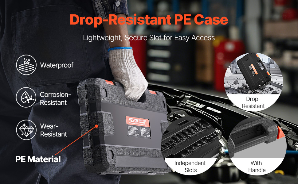 Už žiadne obavy z náhodného pádu alebo rozhádzaného náradia. Pevný úložný kufor z PE je vybavený bezpečnými otvormi pre každú bitovú zásuvku, ktoré ich udržia pevne na mieste, aby sa zabránilo ich strate alebo poškodeniu. Jeho kompaktný dizajn zaručuje jednoduché prenášanie a pohodlné skladovanie doma alebo na cestách.