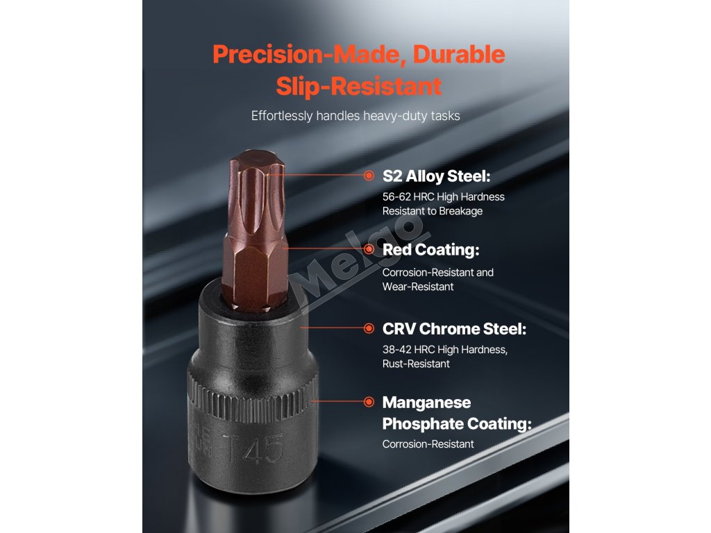 Súprava nástrčných kolíkov torx je vyrobená z vysokopevnostnej legovanej ocele a je navrhnutá tak, aby sa počas používania nelámala, čím sa znižuje riziko nehôd pri opravách. Povrchová úprava bitov, vytvorená tak, aby odolávala korózii, zaisťuje pevné uchopenie a zabraňuje skĺznutiu počas aplikácií s vysokým krútiacim momentom.