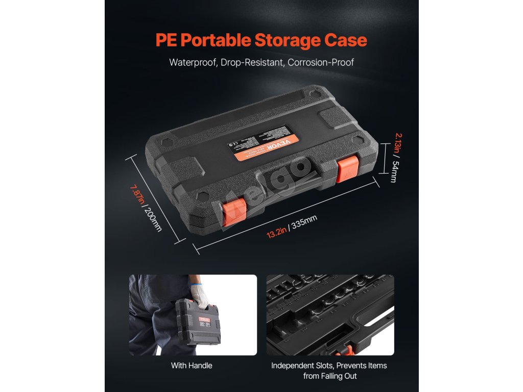 Už žiadne obavy z náhodného pádu alebo rozhádzaného náradia. Pevný úložný kufor z PE je vybavený bezpečnými otvormi pre každú bitovú zásuvku, ktoré ich udržia pevne na mieste, aby sa zabránilo ich strate alebo poškodeniu. Jeho kompaktný dizajn zaručuje jednoduché prenášanie a pohodlné skladovanie doma alebo na cestách.