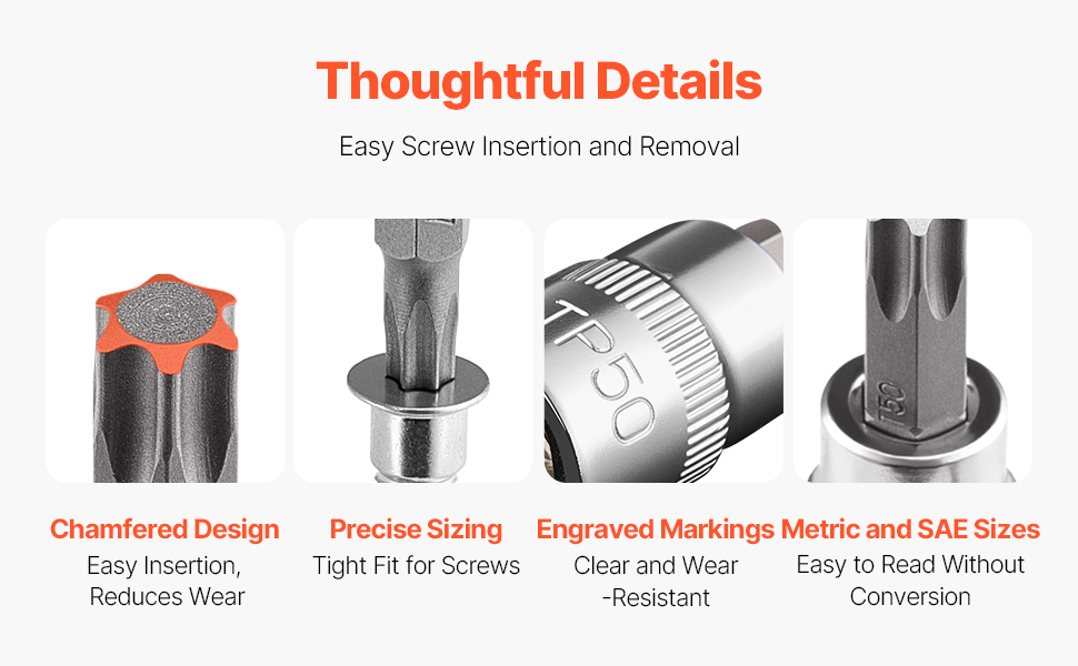 Konštrukcia so skosenými hranami zabezpečuje hladké zasúvanie, čím sa znižuje opotrebovanie a predlžuje životnosť sady bitov torx. Presné rozmery na bezpečné uchytenie s rôznymi typmi skrutiek, jasné značenie umožňuje rýchlu a jednoduchú identifikáciu, vďaka čomu budú vaše opravy bezproblémové.