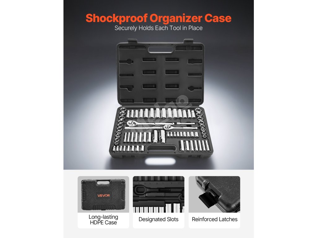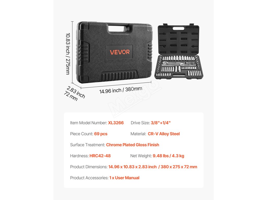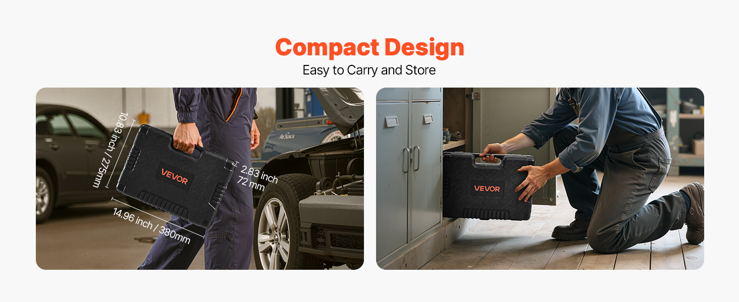 Kufrík metrickej sady nástrčiek, navrhnutý na prenášanie, má rozmery 14,96 x 10,83 x 2,83 palca / 380 x 275 x 72 mm. Jeho kompaktné rozmery sa ľahko zmestia do stiesnených priestorov alebo sa dajú prenášať na cestách, čo zaručuje efektívnu prácu kdekoľvek.