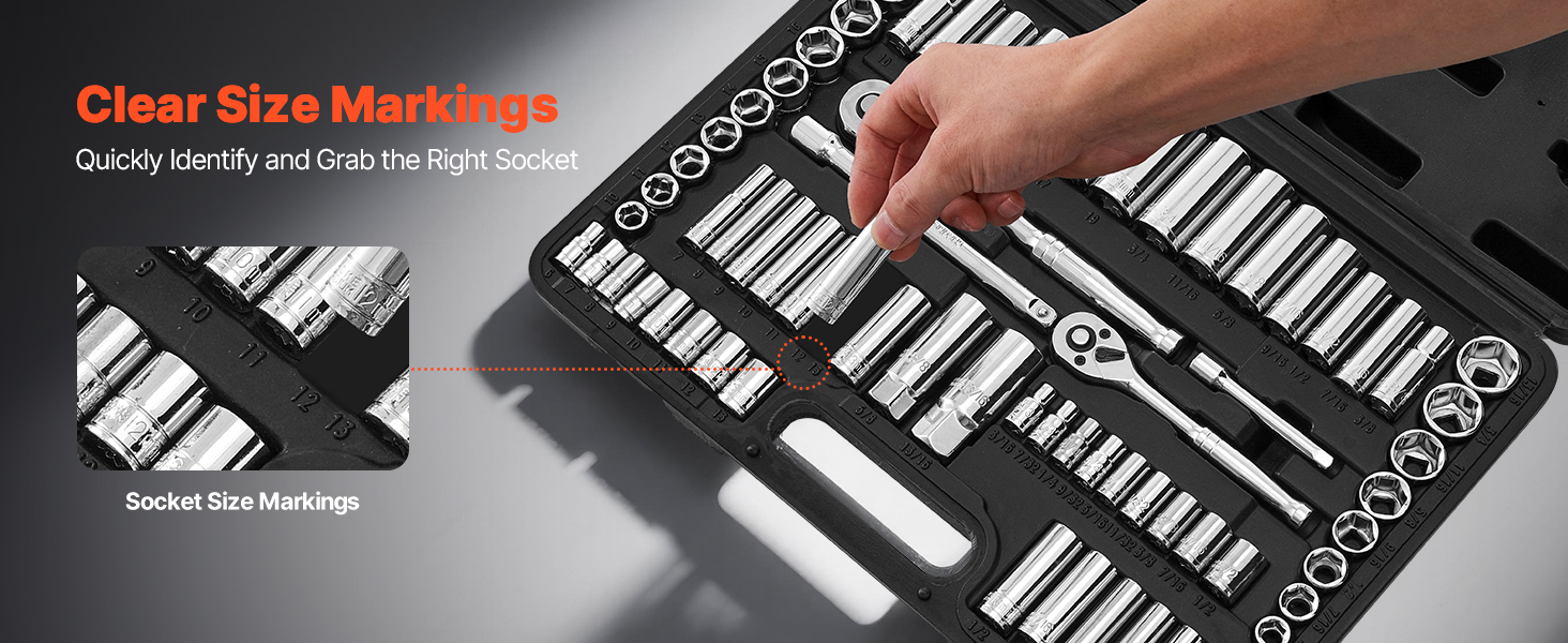 Každá nástrčka má vygravírované, ľahko čitateľné označenie veľkosti, ktoré je vysoko odolné proti opotrebovaniu. Táto súprava nástrčných hlavíc zaručuje rýchlu identifikáciu a rýchlejší prístup k správnemu nástroju, keď ho potrebujete.