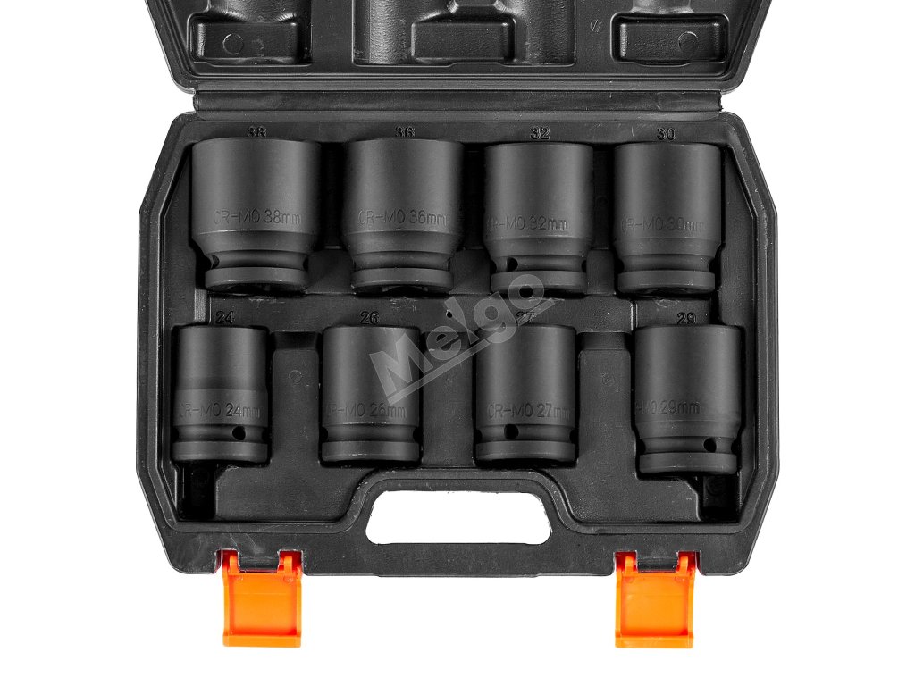 Súprava nástrčných hlavíc na matice vretena obsahuje nástrčné hlavice s veľkosťami 24 mm, 26 mm, 27 mm, 29 mm, 30 mm, 32 mm, 36 mm a 38 mm, ktoré sú ideálne na efektívne uťahovanie matíc a skrutiek náprav.