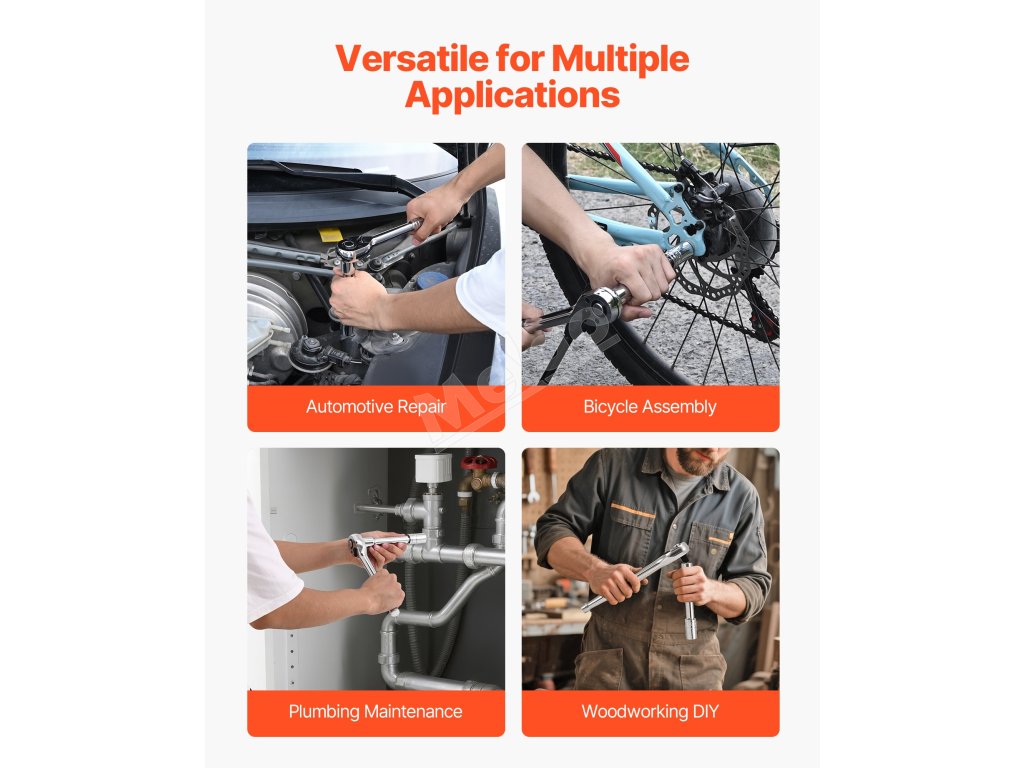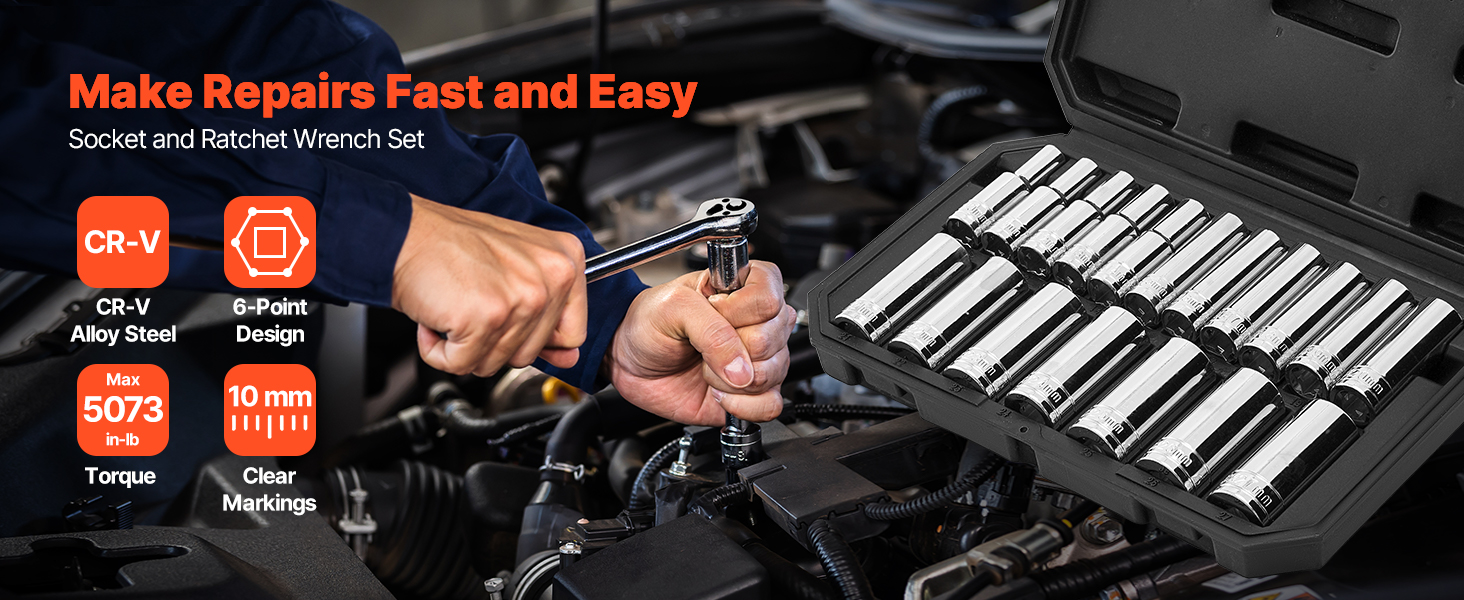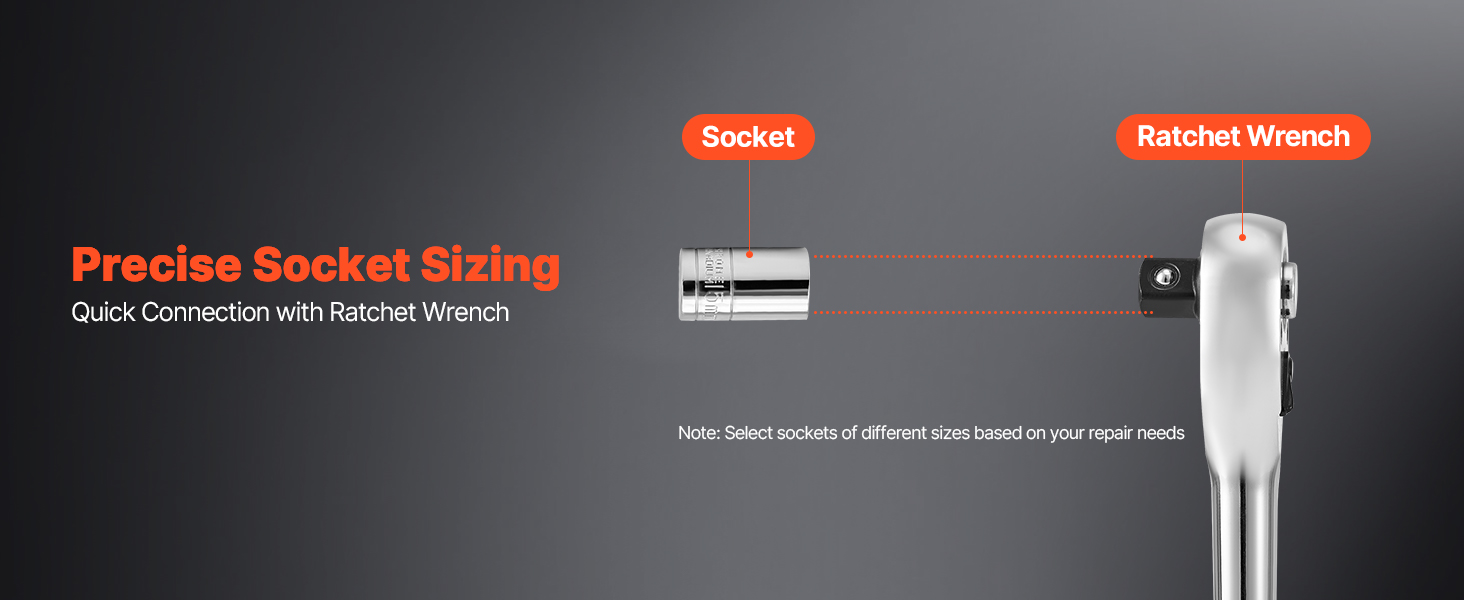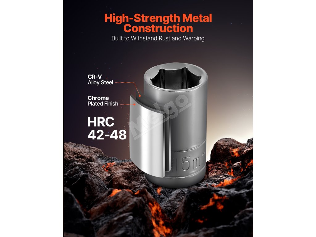 Presne dimenzované nástrčné hlavice zaručujú ideálne prispôsobenie račňovému kľúču. Bez námahy vymieňajte medzi rôznymi veľkosťami, aby ste zvýšili efektivitu a prispôsobivosť pre širokú škálu aplikácií.