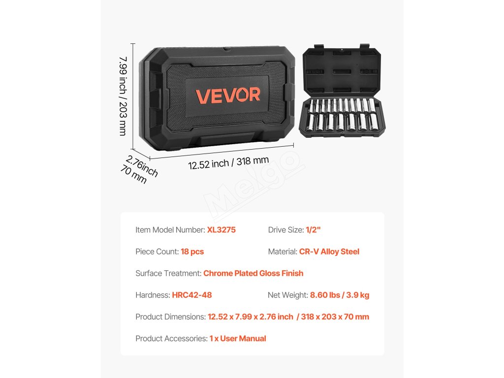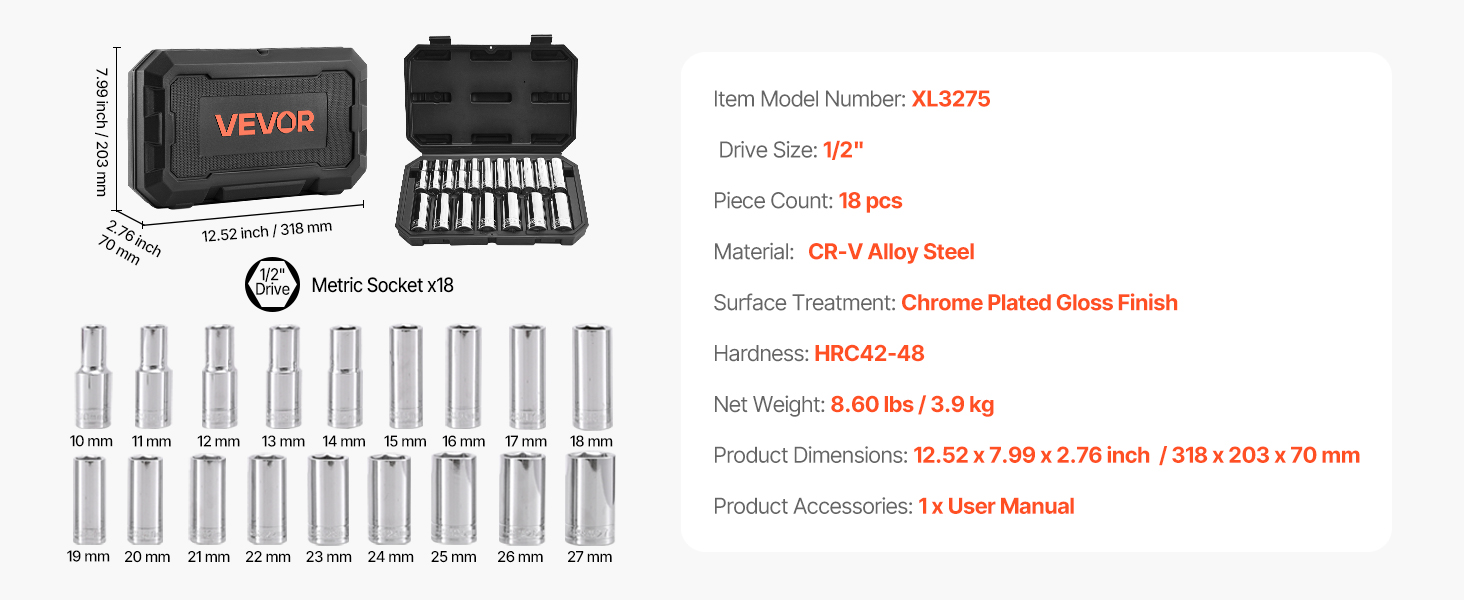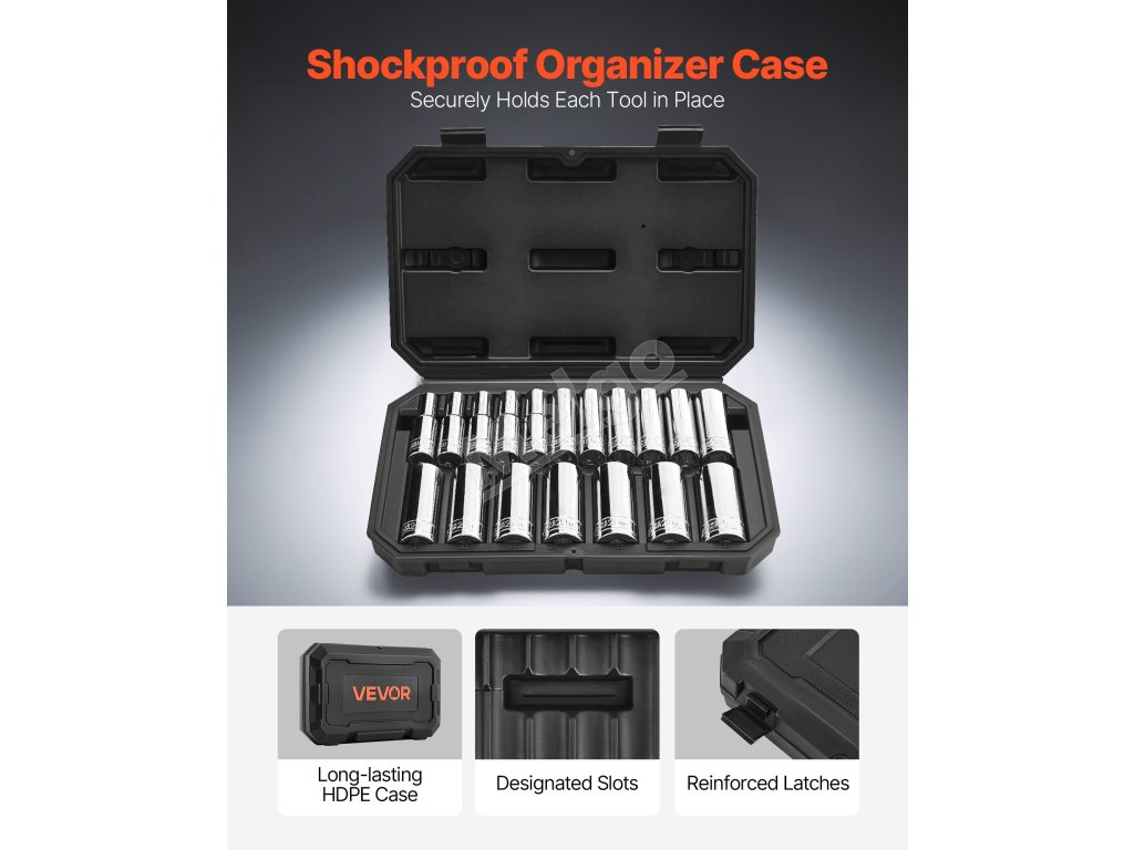Táto sada nástrčiek 1/2 palca je vyrobená z vysokokvalitných materiálov odolných voči korózii a poskytuje vynikajúci rázový výkon. Konštrukcia s vysokým krútiacim momentom zaisťuje dostatočnú silu na riešenie zadretých alebo skorodovaných matíc, čo urýchľuje a uľahčuje opravy a demontáž.