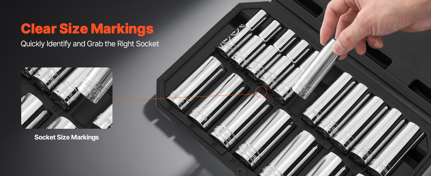 Každá nástrčka má vyryté, ľahko čitateľné označenie veľkosti, ktoré je vysoko odolné proti opotrebovaniu. Táto sada nástrčných hlavíc zaručuje rýchlu identifikáciu a rýchlejší prístup k správnemu nástroju, keď ho potrebujete.
