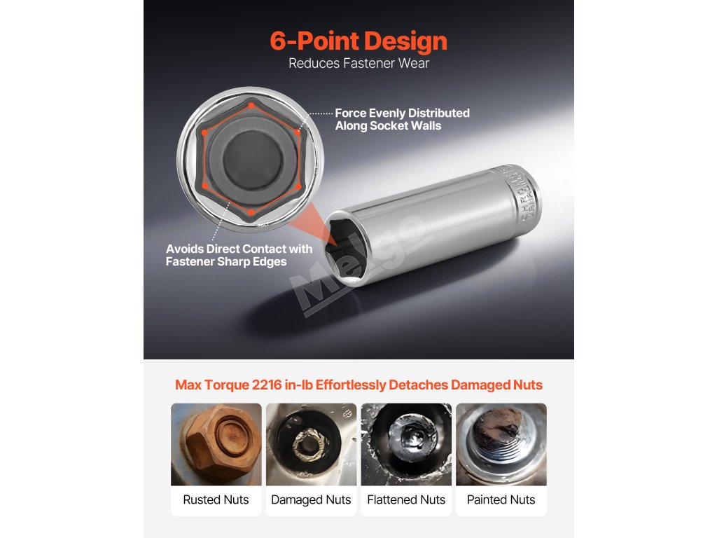 Táto sada nástrčiek 3/8 palca je vyrobená z vysokokvalitných materiálov odolných voči korózii a poskytuje vynikajúci rázový výkon. Konštrukcia s vysokým krútiacim momentom zaisťuje dostatočnú silu na riešenie zadretých alebo skorodovaných matíc, čo urýchľuje a uľahčuje opravy a demontáž.