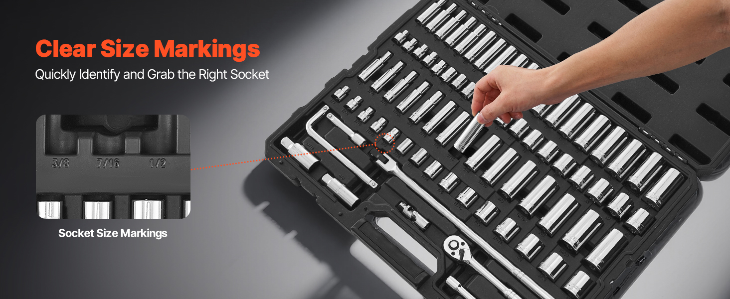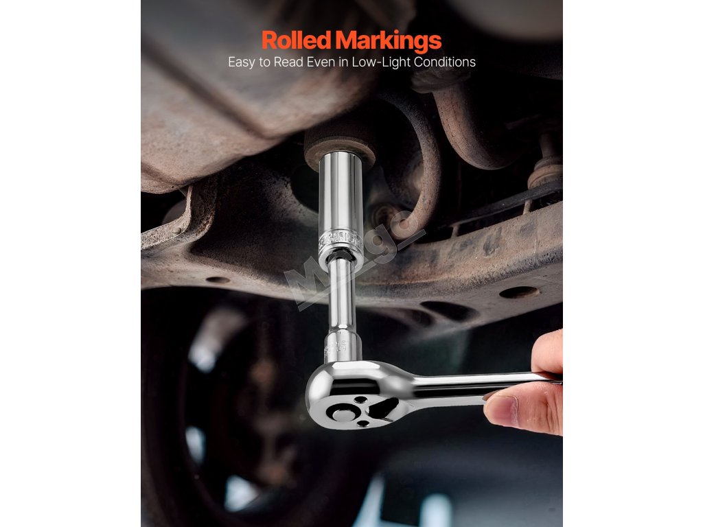 Každá nástrčka má vygravírované, ľahko čitateľné označenie veľkosti, ktoré je vysoko odolné proti opotrebovaniu. Táto súprava nástrčných hlavíc zaručuje rýchlu identifikáciu a rýchlejší prístup k správnemu nástroju, keď ho potrebujete.