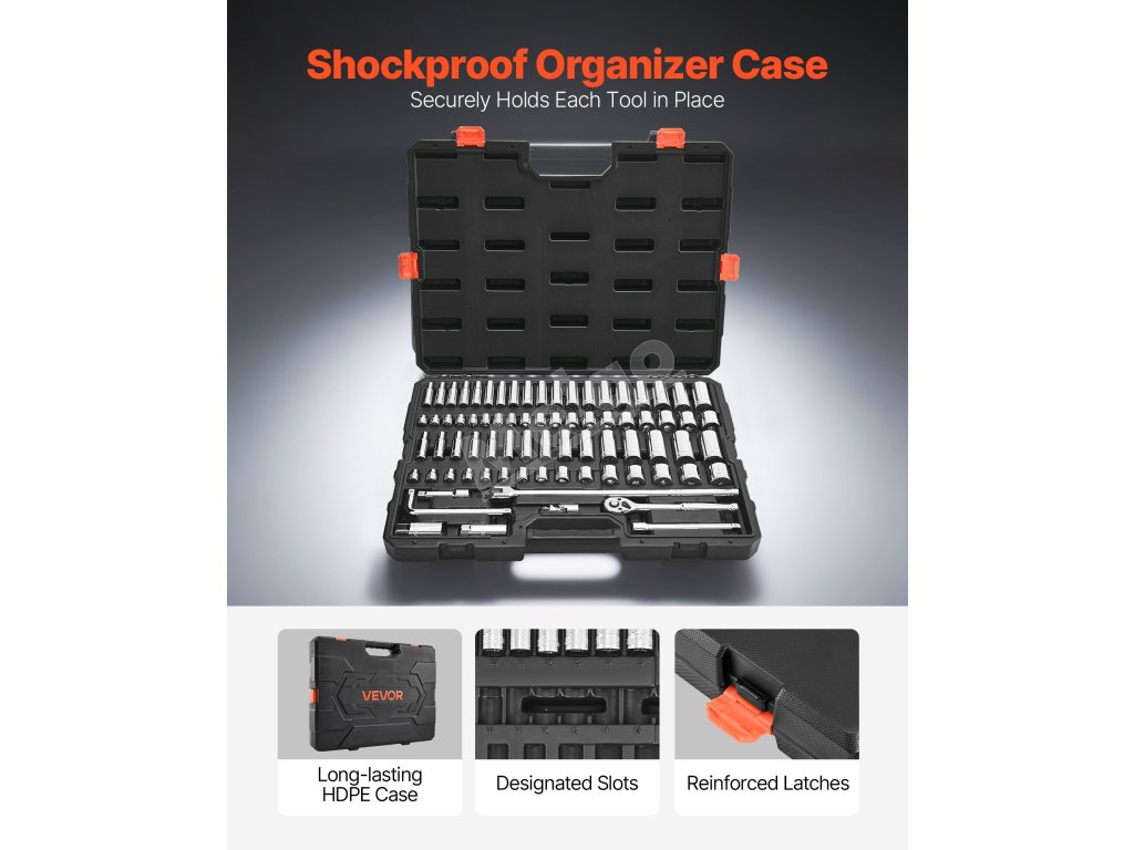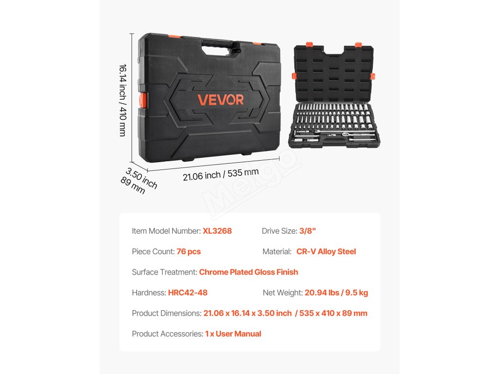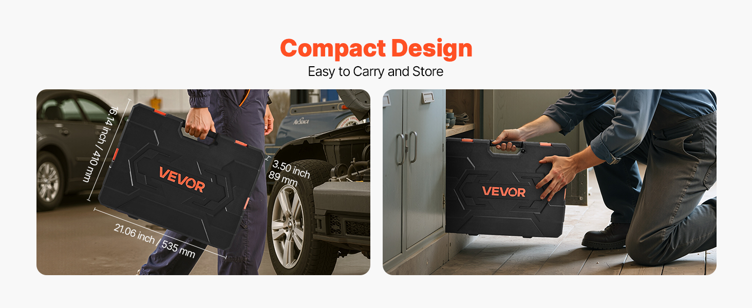 Kufrík metrickej sady nástrčiek, navrhnutý na prenášanie, má rozmery 21,06 x 16,14 x 3,50 palca / 535 x 410 x 89 mm. Jeho kompaktné rozmery sa ľahko zmestia do stiesnených priestorov alebo sa dajú prenášať na cestách, čo zaručuje efektívnu prácu kdekoľvek.