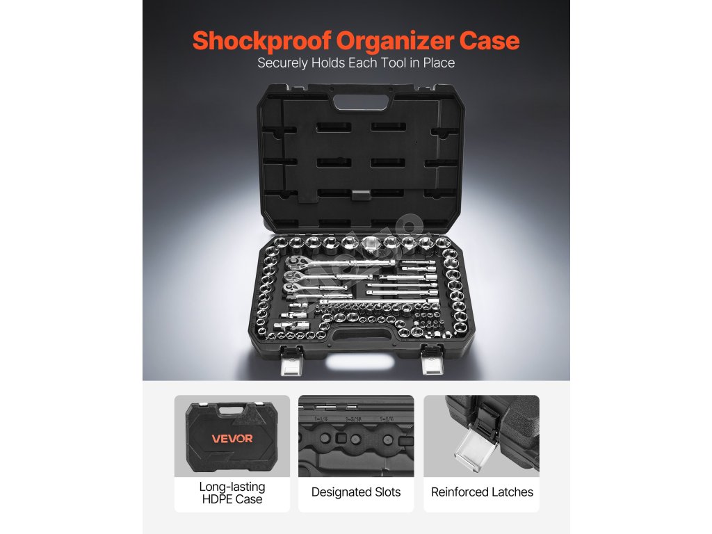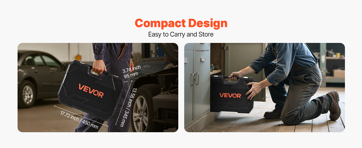 Kufrík s metrickou sadou nástrčiek je navrhnutý na prenášanie a má rozmery 17,72 x 13,58 x 3,74 palca / 450 x 345 x 95 mm. Jeho kompaktné rozmery sa ľahko zmestia do stiesnených priestorov alebo sa dajú prenášať na cestách, čo zaručuje efektívnu prácu kdekoľvek.